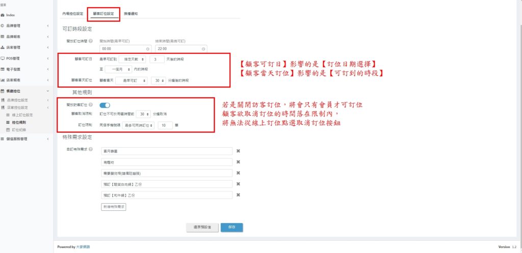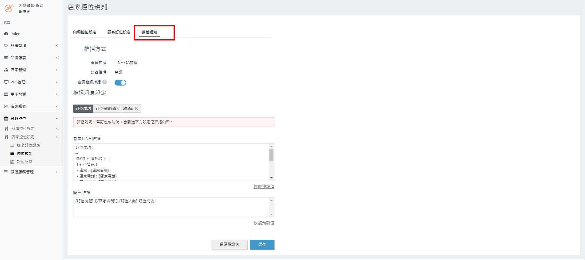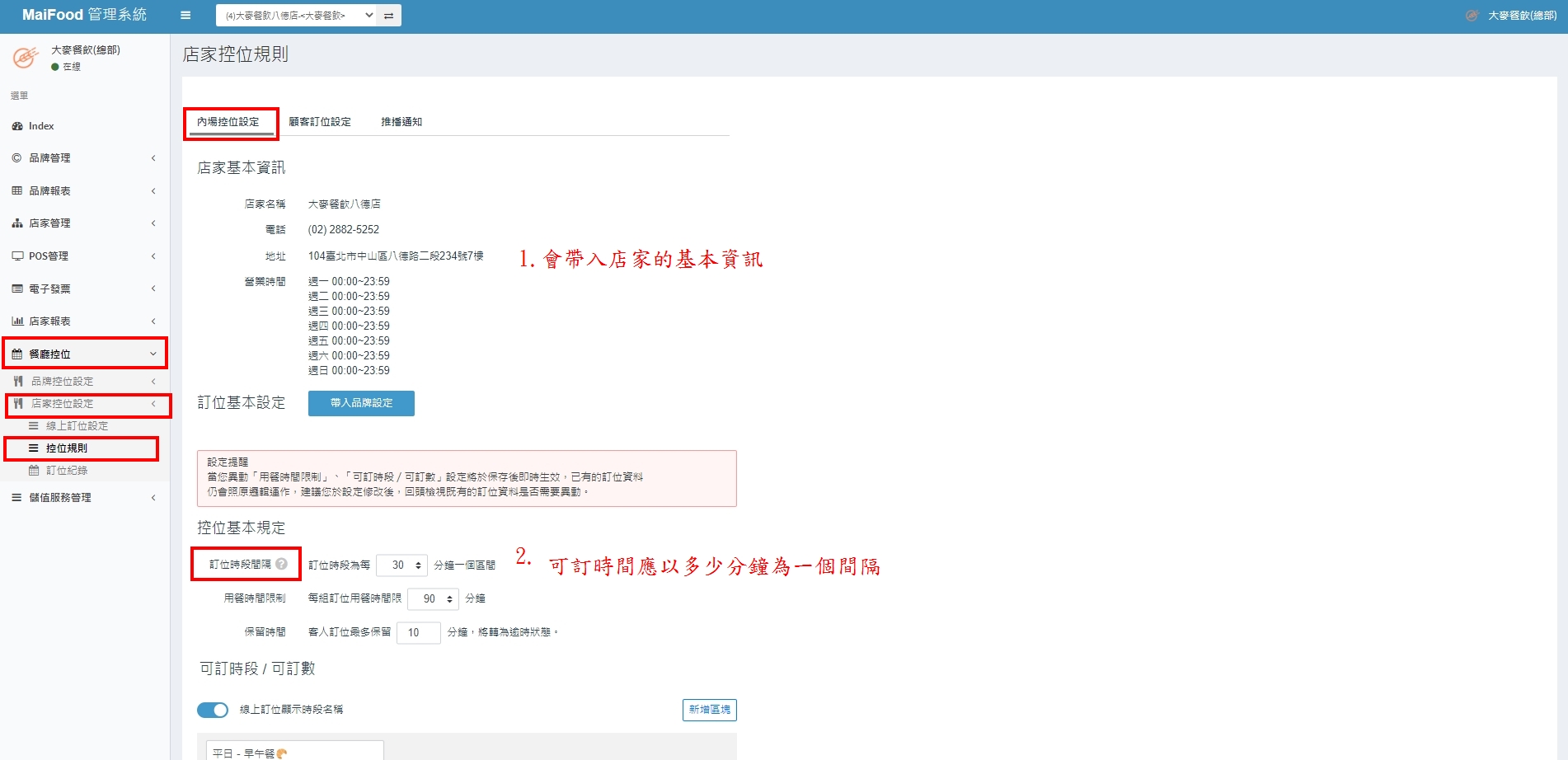登入後台>>餐廳控位>>店家控位設定>>控位規則