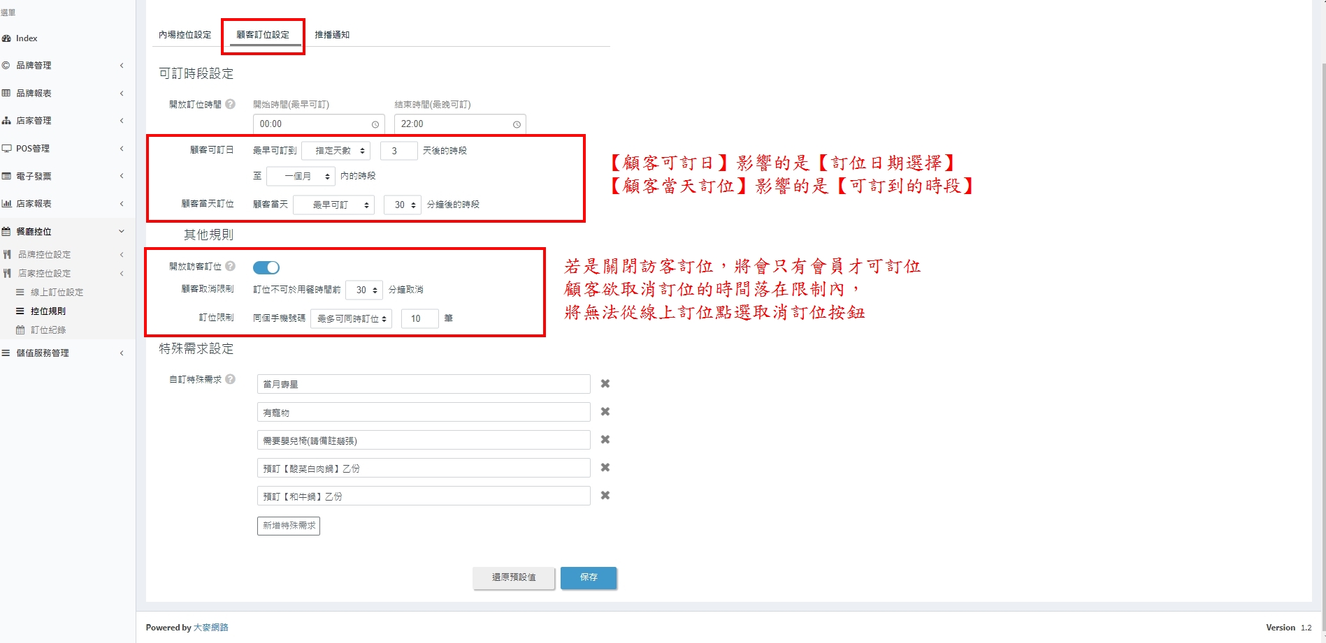 ※可自訂最多6組特殊需求,供線上訂位及POS訂位備註使用(字數不得超過15字)