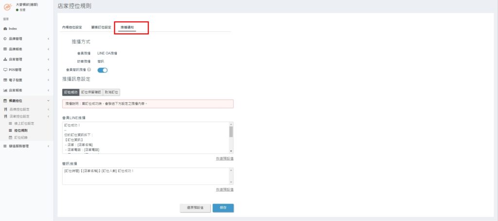 • 推播及簡訊內容可自行編輯,預設訊息中包含{}字樣的訊息為系統判斷帶入,建議不要刪除,若不慎刪除可點選【恢復預設值】