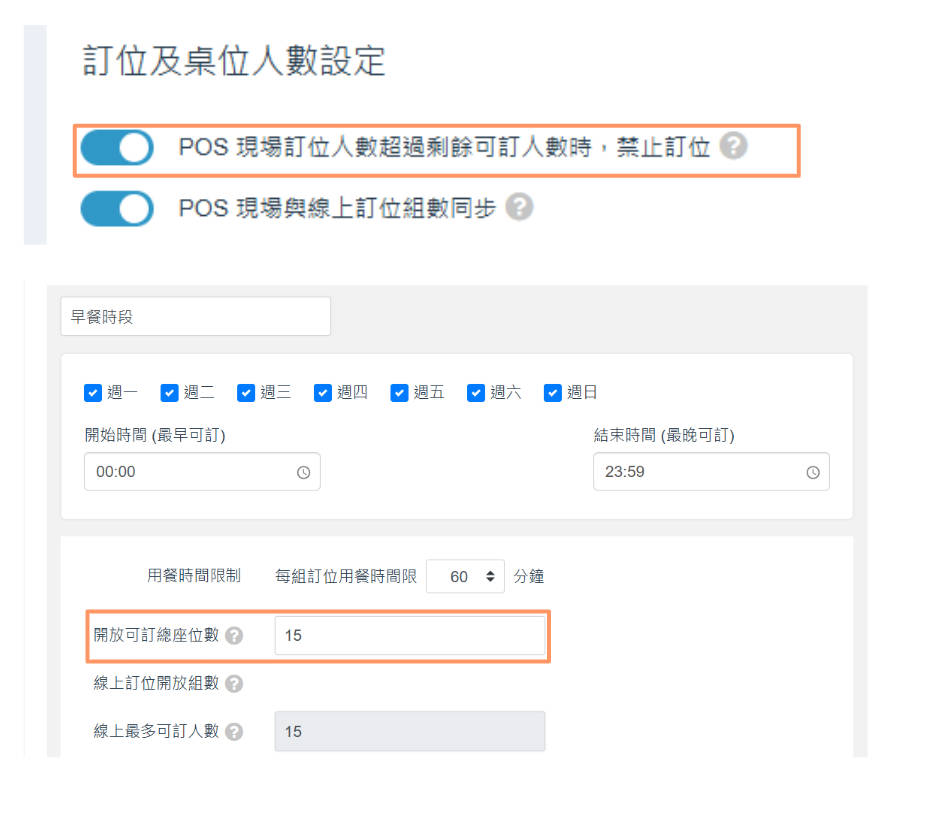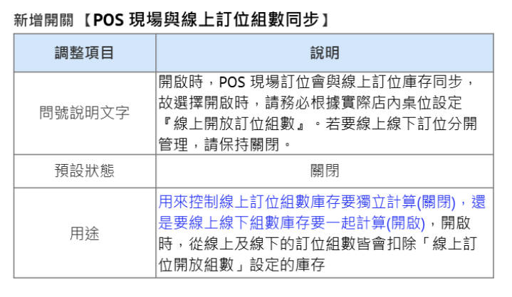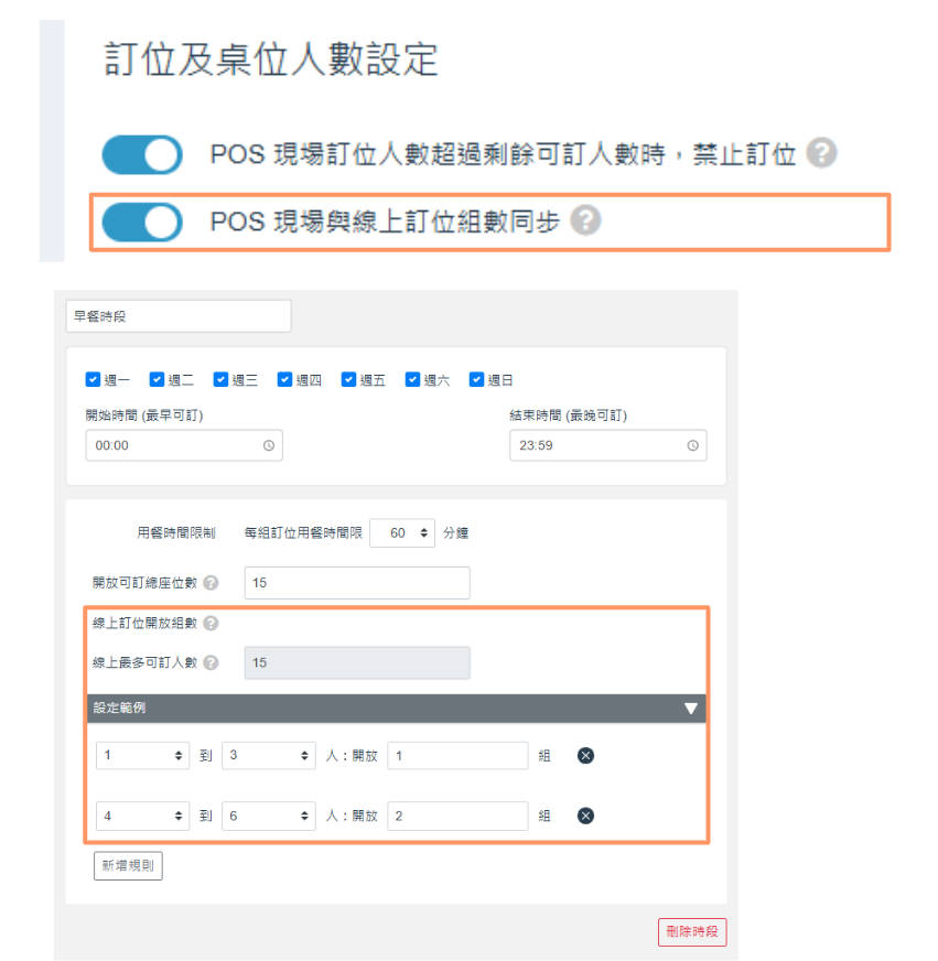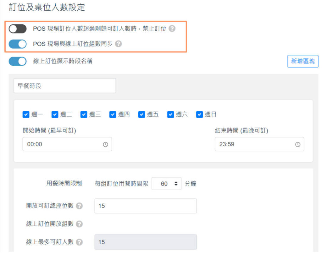 「POS 現場與線上訂位組數同步」此開關的組數庫存是跟據線上訂位開放組數的設定