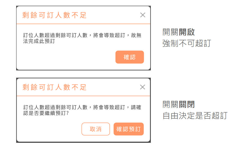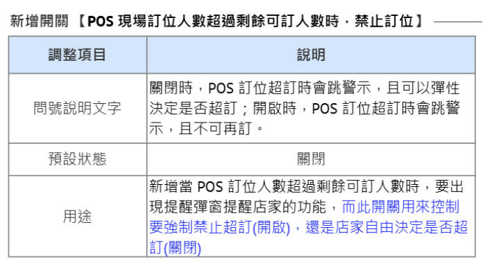 用途 : 店家可自由決定線下訂位人數超過總人數時,是否繼續超訂