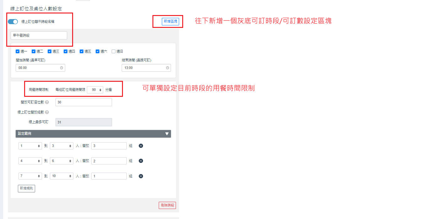 • 用餐時段限制,僅可於單一時段設定區塊內進行可訂數控管