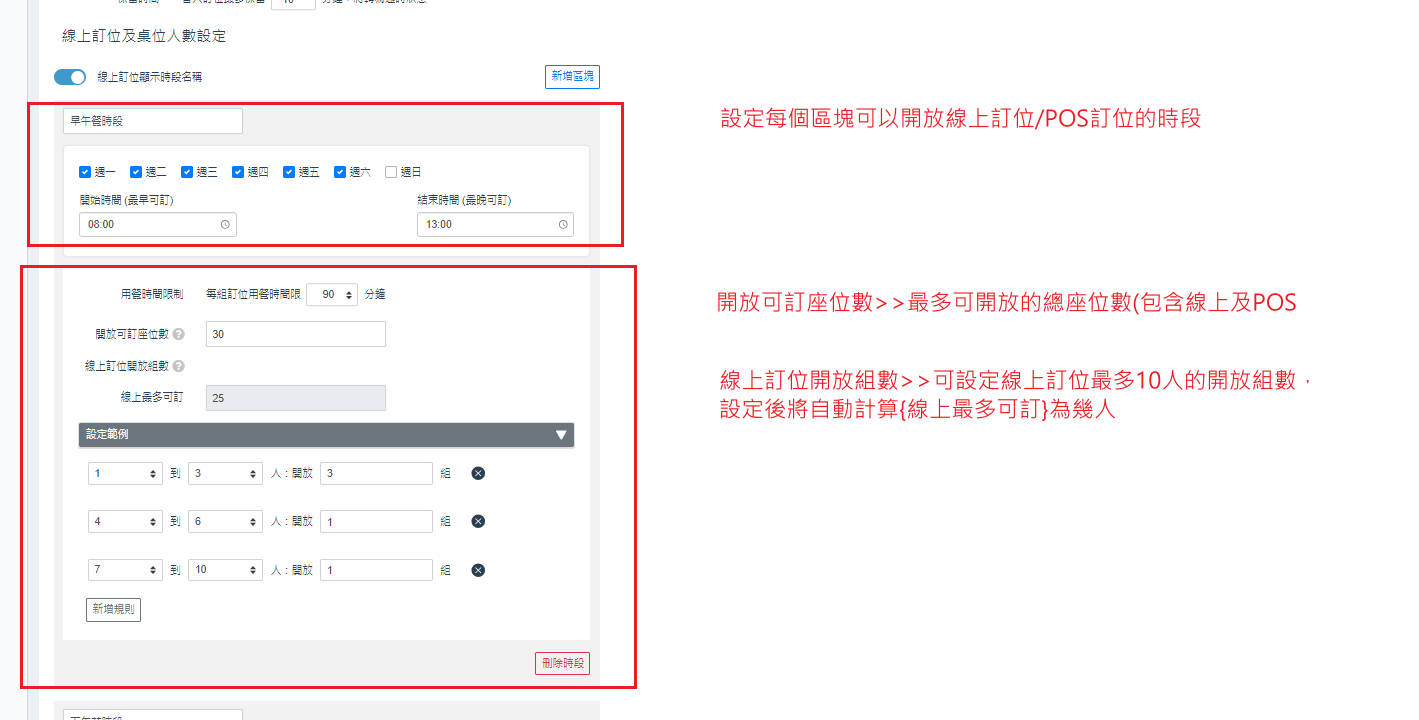 用途 : 店家可自由決定訂位組數要線上線下分開管理或合併管理