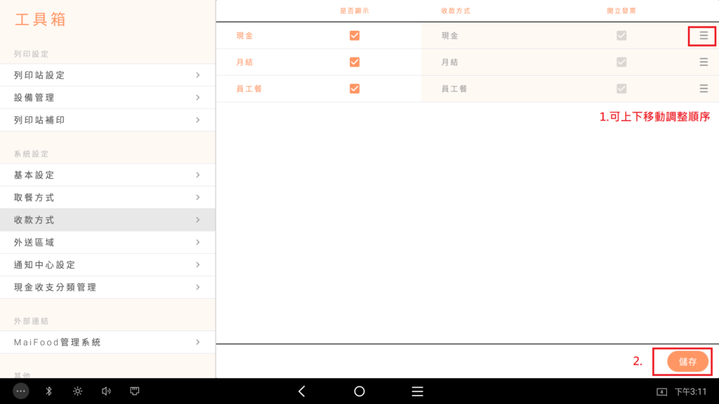搜尋 搜尋 首頁 » MoneyPOS操作 » 工具箱 » 其他 » POS收款順序與顯示 若您有新增線下付款別,發現找不到您要使用的,或是您想變更順序方便結帳流程您可以至【 設定 】/【 工具箱 】/【 收款方式】/【 調整右方橫線】/ 上下移動調整順序/ 【儲存】 結帳時,順序即會跟著您的設定呈現 提醒您 結帳頁面呈現付款別最多只能呈現10個唷! 以上若無法排除,請聯繫大麥售後客服協助處理。 ✍🏻找到答案了嗎? Let us know if you liked the post. That’s the only way we can improve. 🙂 🙁 Categories: 其他工具箱Tags: 收款