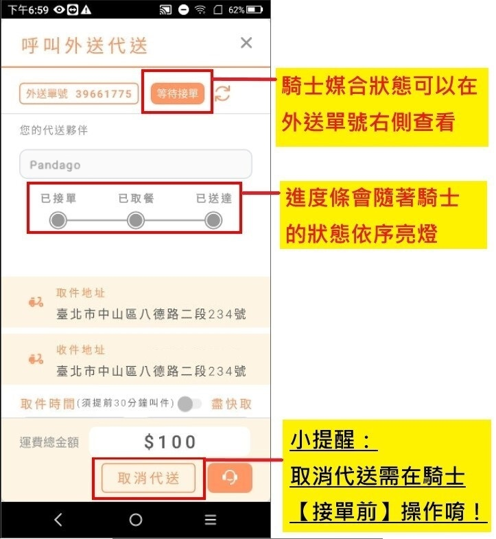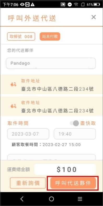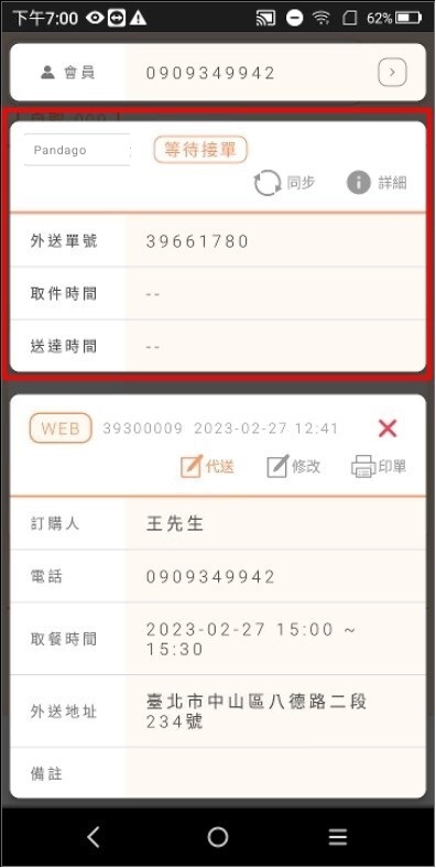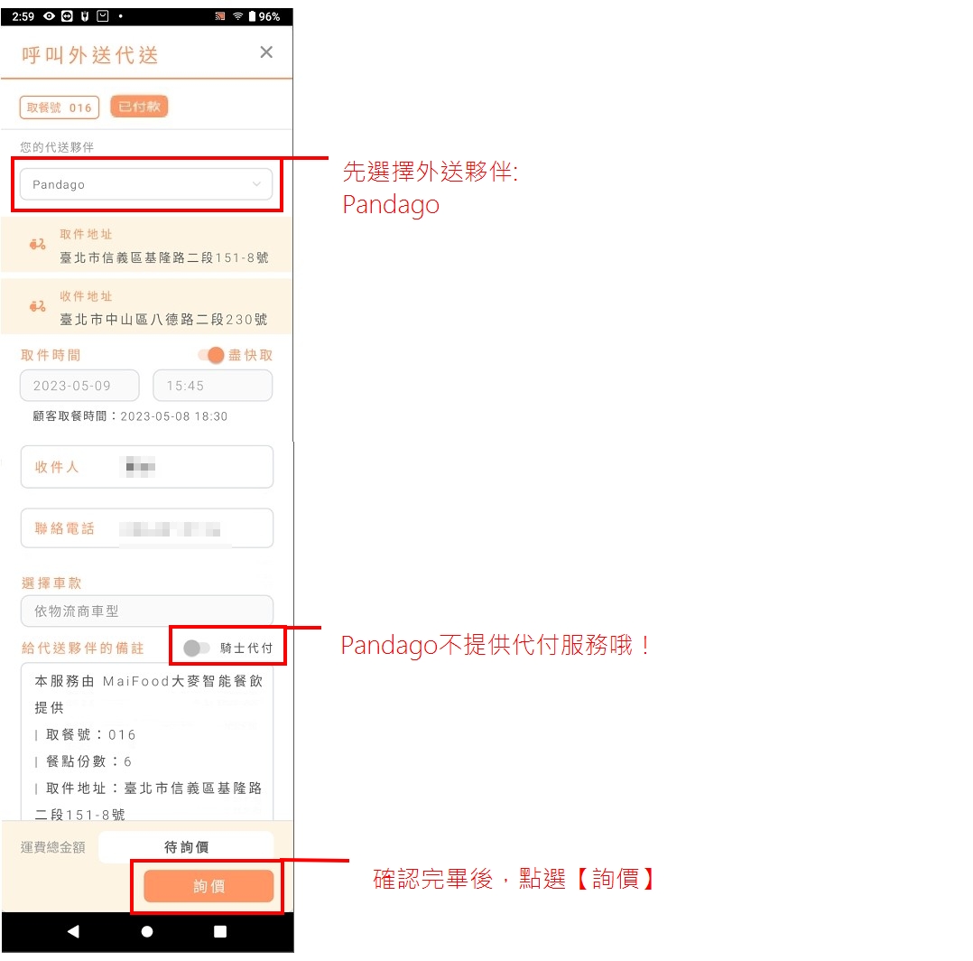 搜尋 搜尋 首頁 » 第三方資訊 » 物流 » pandago » Pandago|V2呼叫Pandago 在接單機要怎麼進行代送服務呢?以下一一引導您進行操作!在V2接單上呼叫外送夥伴,可以在操作前,先設定呼叫視窗是否要自動於結帳後跳出唷! 呼叫前,訂單需先「完成結帳」,變成結帳單後,右上角才會出現代送按鈕,讓我們點選「代送」按鈕一下! 點選代送後,請依序設定1.選擇外送夥伴2.進行詢價小提醒:Pandago是不提供騎士代付功能的唷! 進行詢價後,會顯示運費總金額,此金額將從「大麥點」進行扣款。沒問題後再點選「呼叫代送夥伴」進行騎士的媒合。點我登入查詢大麥點餘額 呼叫代送後,可以確認騎士的接單狀態如需取消代送,需於騎士接單前操作唷! 關閉呼叫外送代送視窗後,可以於訂單詳細資訊上方點選『同步』後查看最新外送進度。 ※由於Pandago媒合率極高且騎士接單後就無法取消,請謹慎確認後再進行呼叫!! Pandago取消訂單責任歸屬 ✍🏻找到答案了嗎? Let us know if you liked the post. That’s the only way we can improve. 🙂 🙁 Categories: pandago物流第三方資訊Tags: pandago外送外送夥伴外送平台熊貓物流