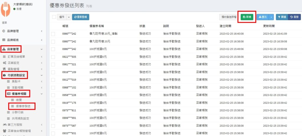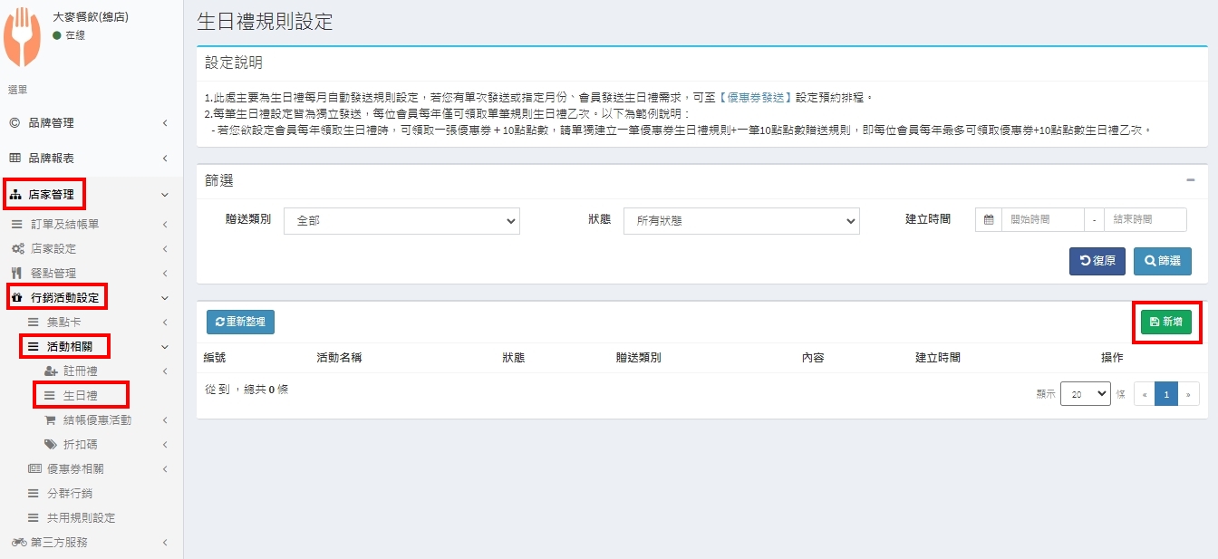 您可在此頁面檢視、操作編輯目前建立的優惠券,若要新增其他生日禮,可將原有的生日禮規則『刪除』(該券將不再發送,但已拿到該券的客人仍可繼續使用)或『編輯』,也可以再新增一張新的優惠券。
