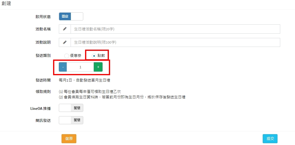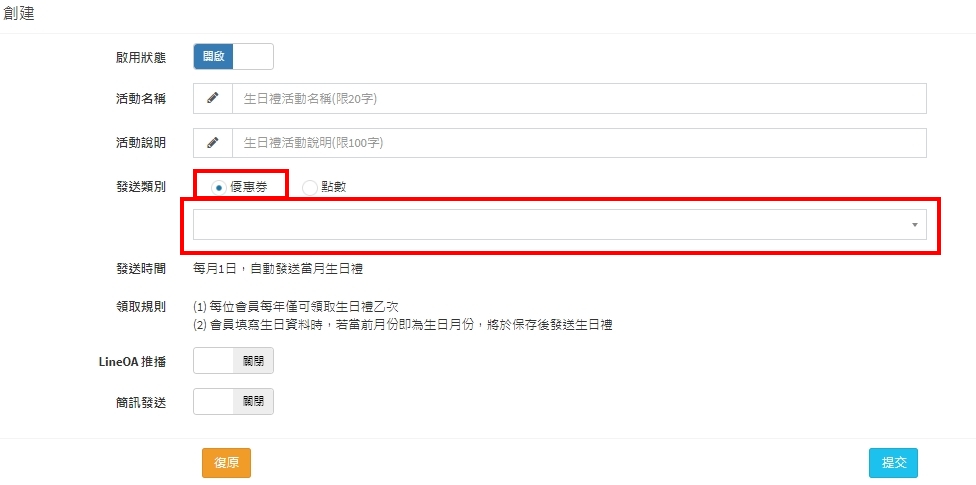 生日禮的建立可選擇贈送優惠券或是贈送點數。