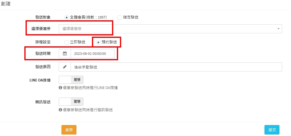 進入新增頁面後,請在輸入活動名稱及說明後,於發送類別選擇「優惠券」,並在下方欄位選擇新增好的生日禮優惠券。