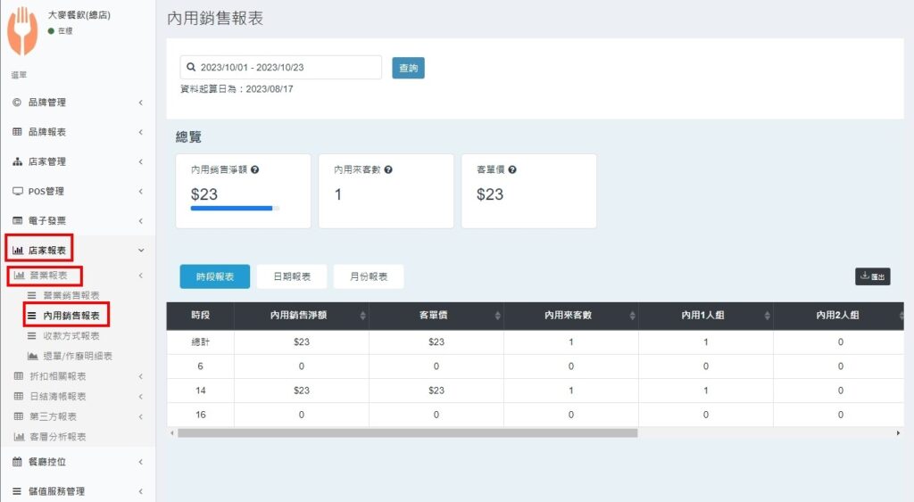 【 店家報表 】/【 營業報表】/【 內用銷售報表 】