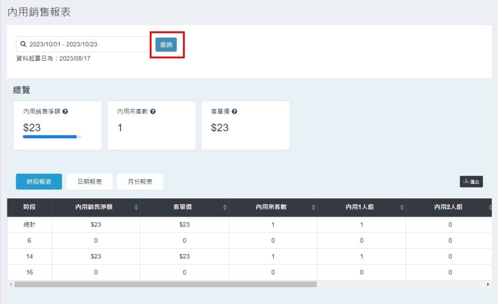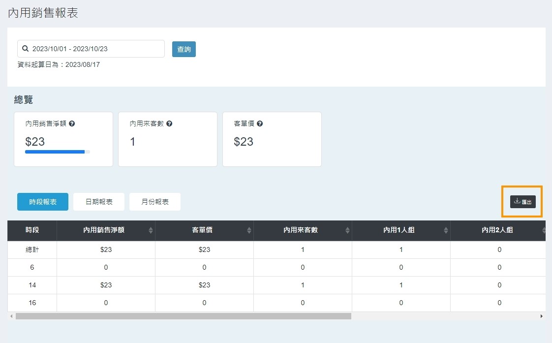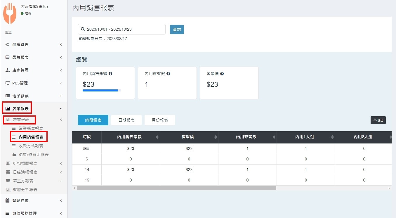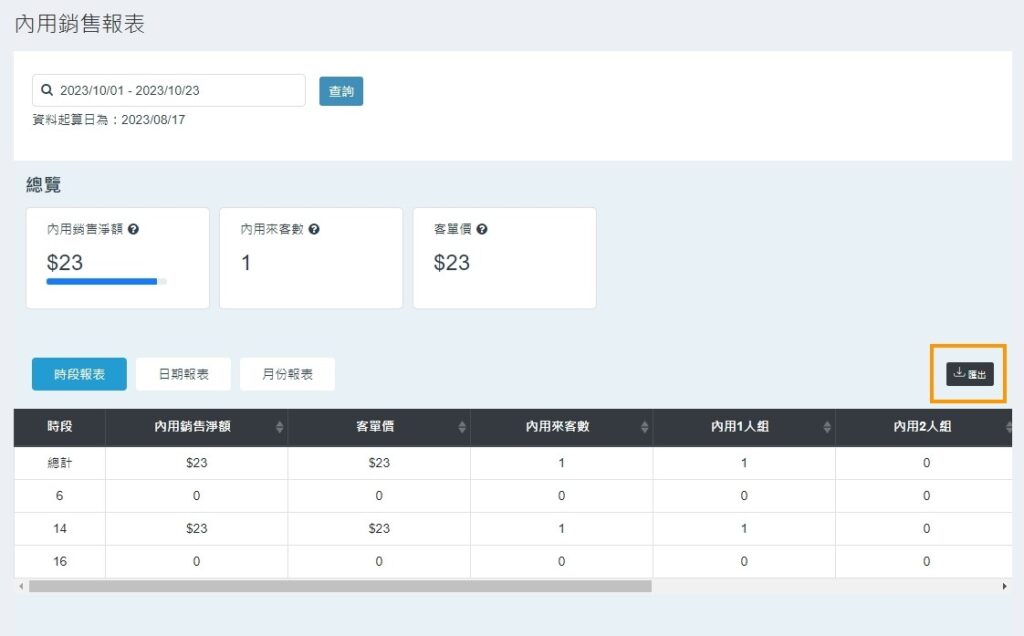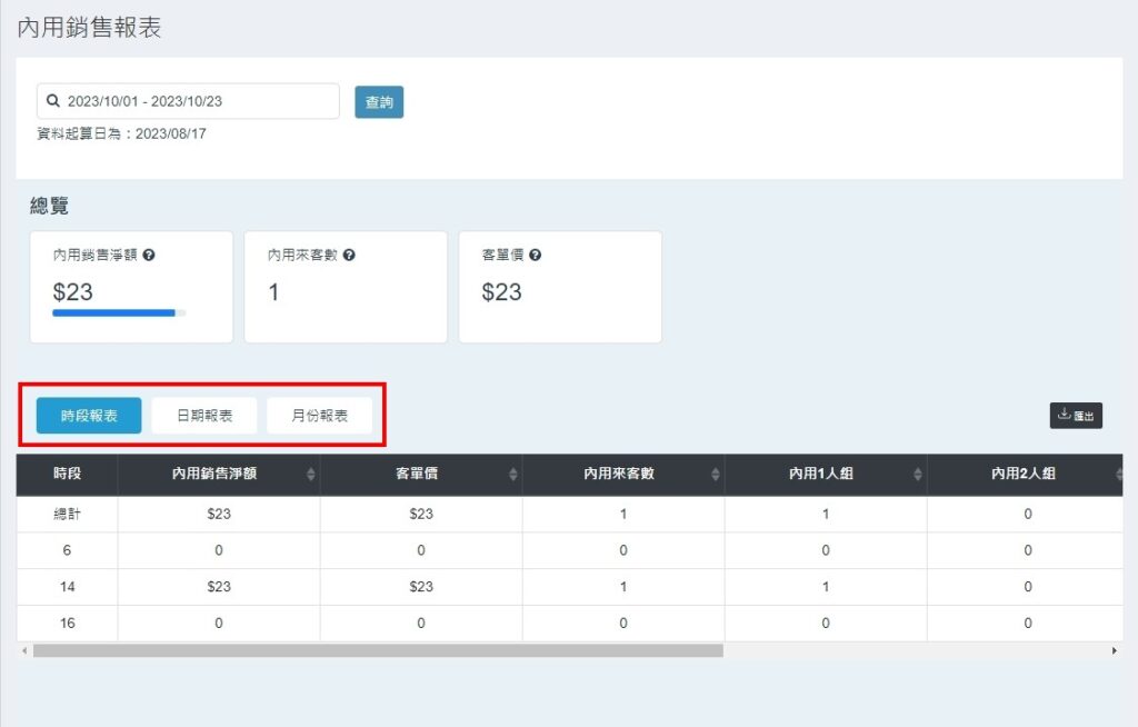 內用銷售報表將會記錄所有內用人數,並計算客單價。