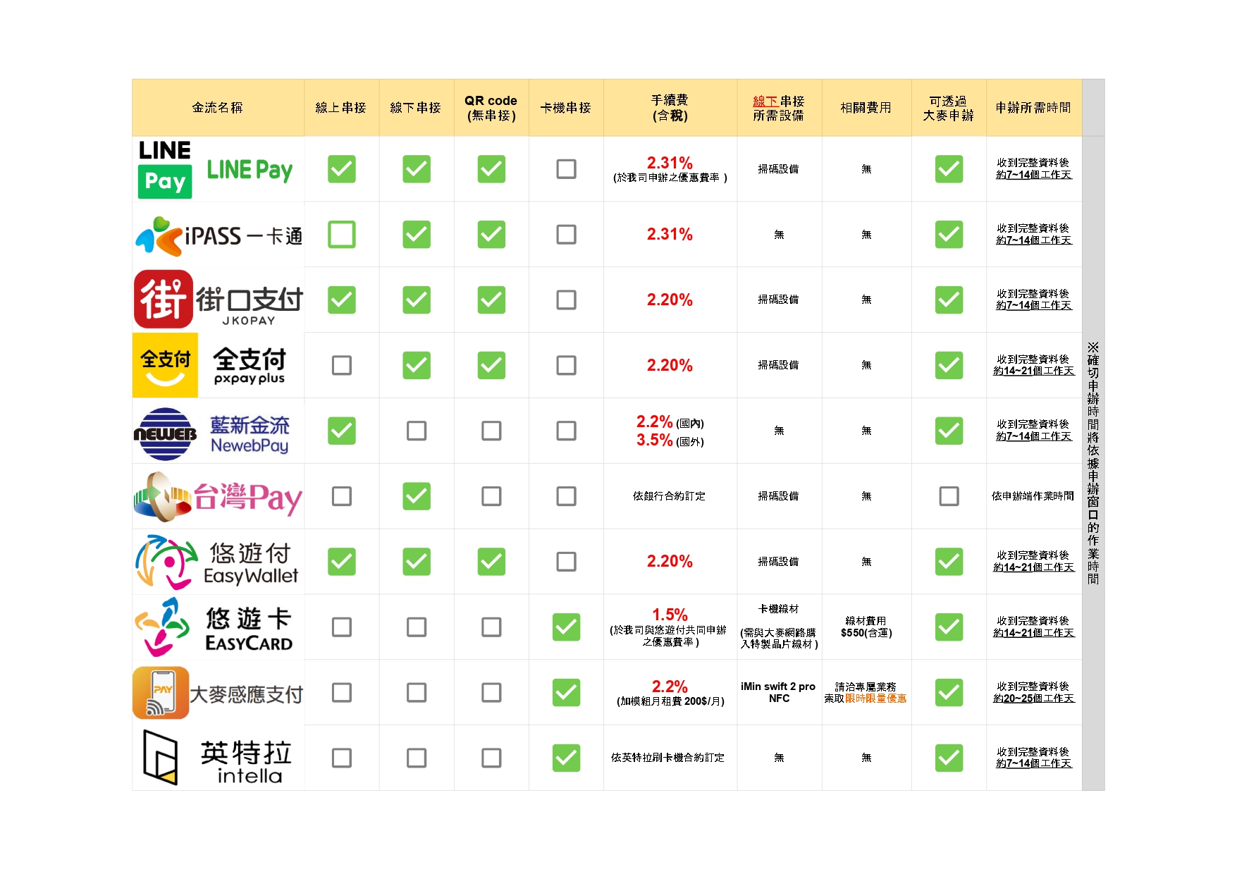 搜尋 搜尋 首頁 » 第三方資訊 » 金流|金流比一比 目前大麥有配合的金流有:LINE Pay、街口支付、全支付、藍新金流、悠遊付、悠遊卡機、台新卡機、英特拉。以下為各個金流的比較圖: ✍🏻找到答案了嗎? Let us know if you liked the post. That’s the only way we can improve. 🙂 🙁 Categories: LINE Pay全支付台新信用卡悠遊卡&悠遊付第三方資訊英特拉藍新街口支付金流Tags: 信用卡外送外送夥伴悠遊卡比較物流英特拉