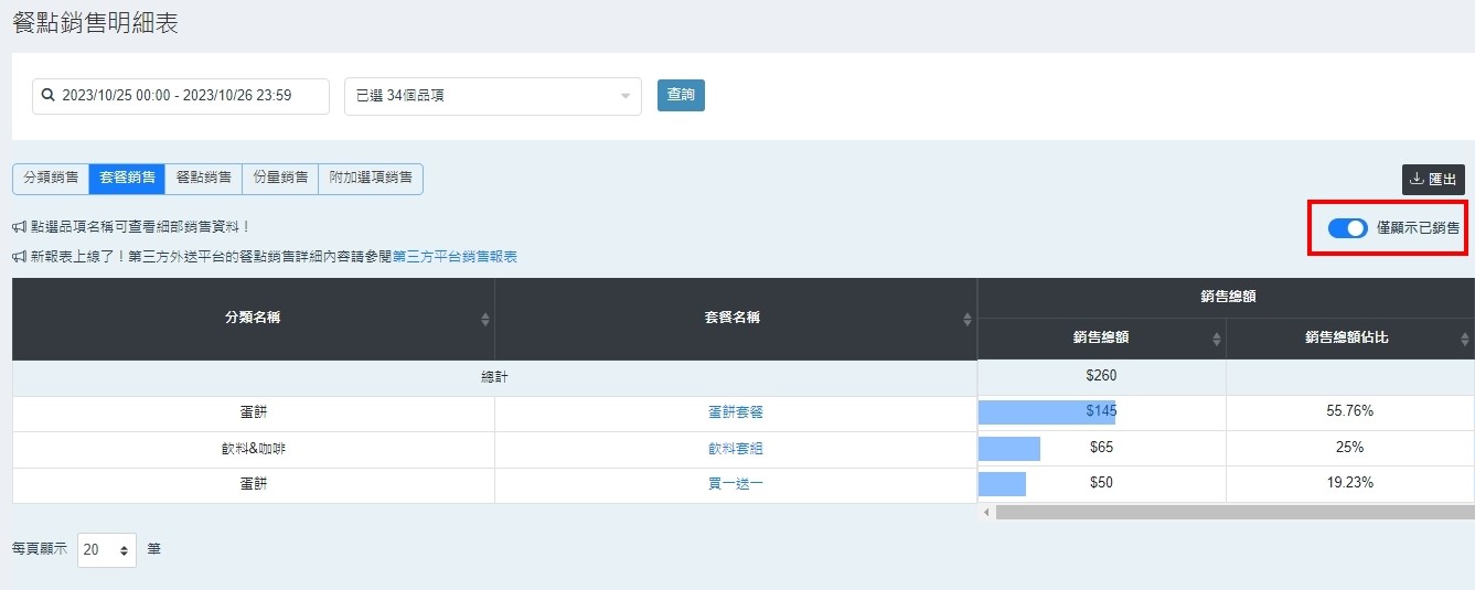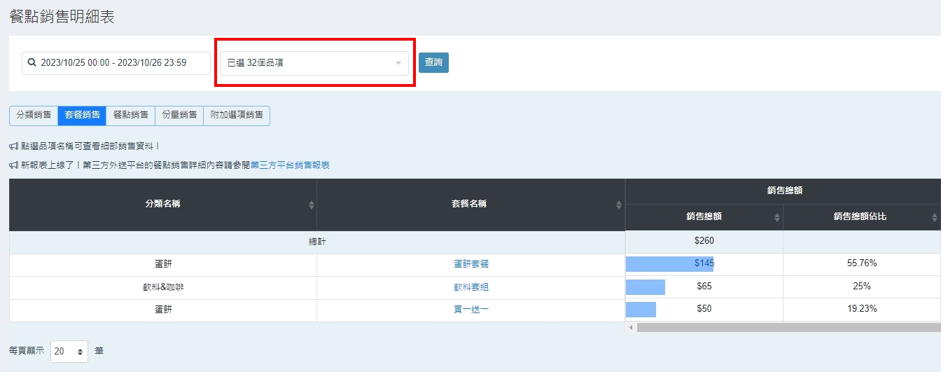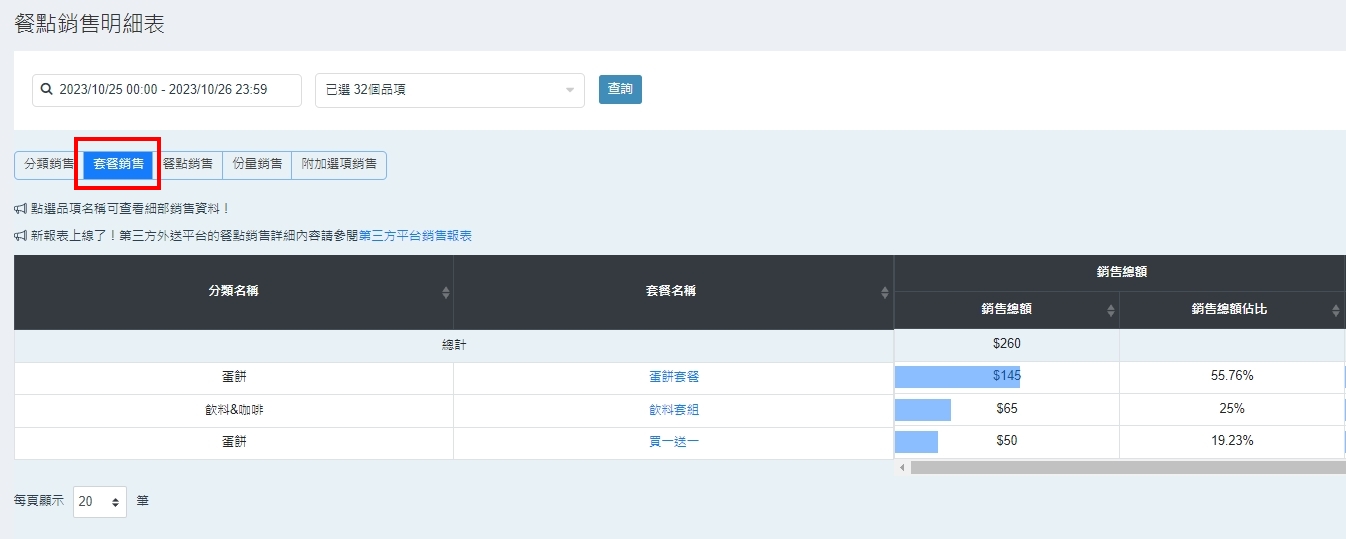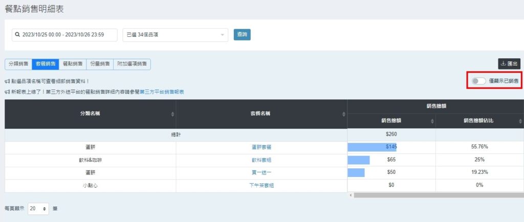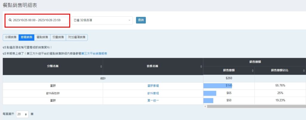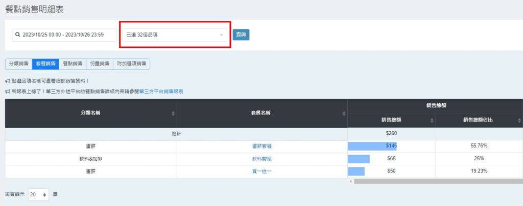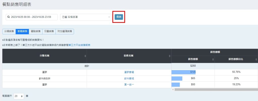 7.最後選擇 【套餐銷售】 即可查看到附加選項的銷售狀況。