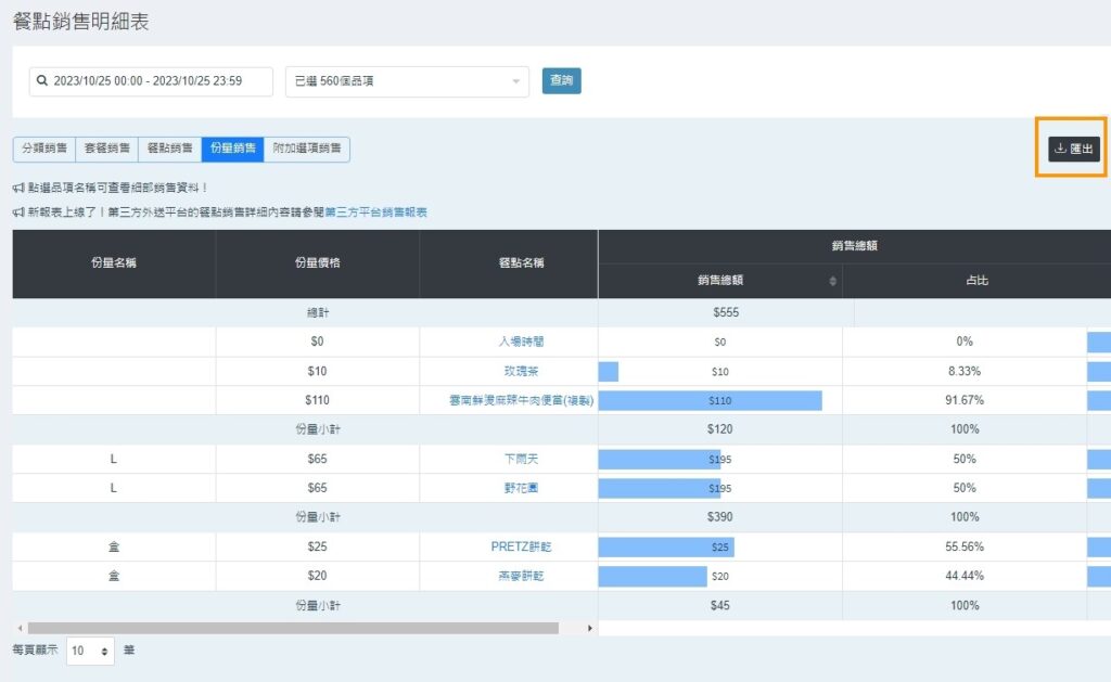 銷售總額:每一個份量下的小計(淡藍色區塊)為該選項之銷售總額。