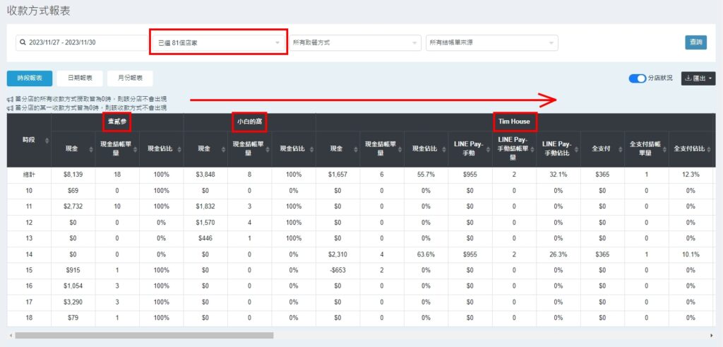 5.品牌可以選擇要查看 「各分店」或「全體」的收款方式資料