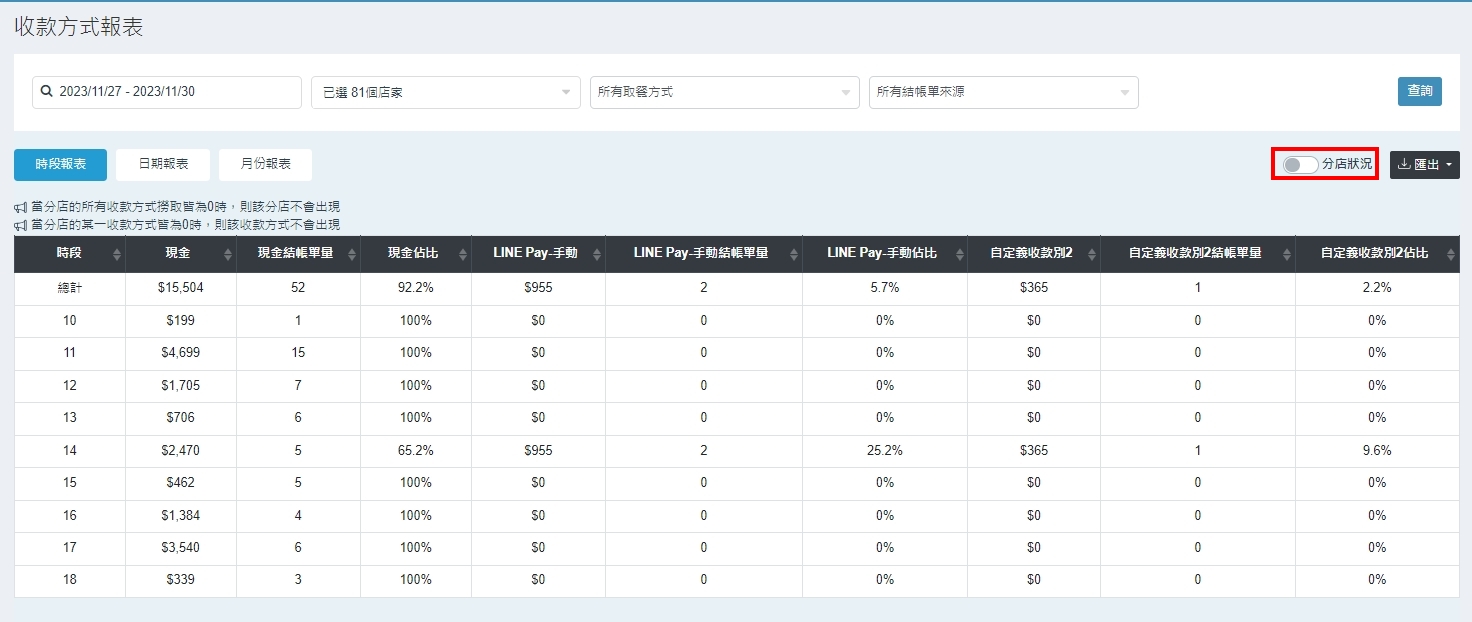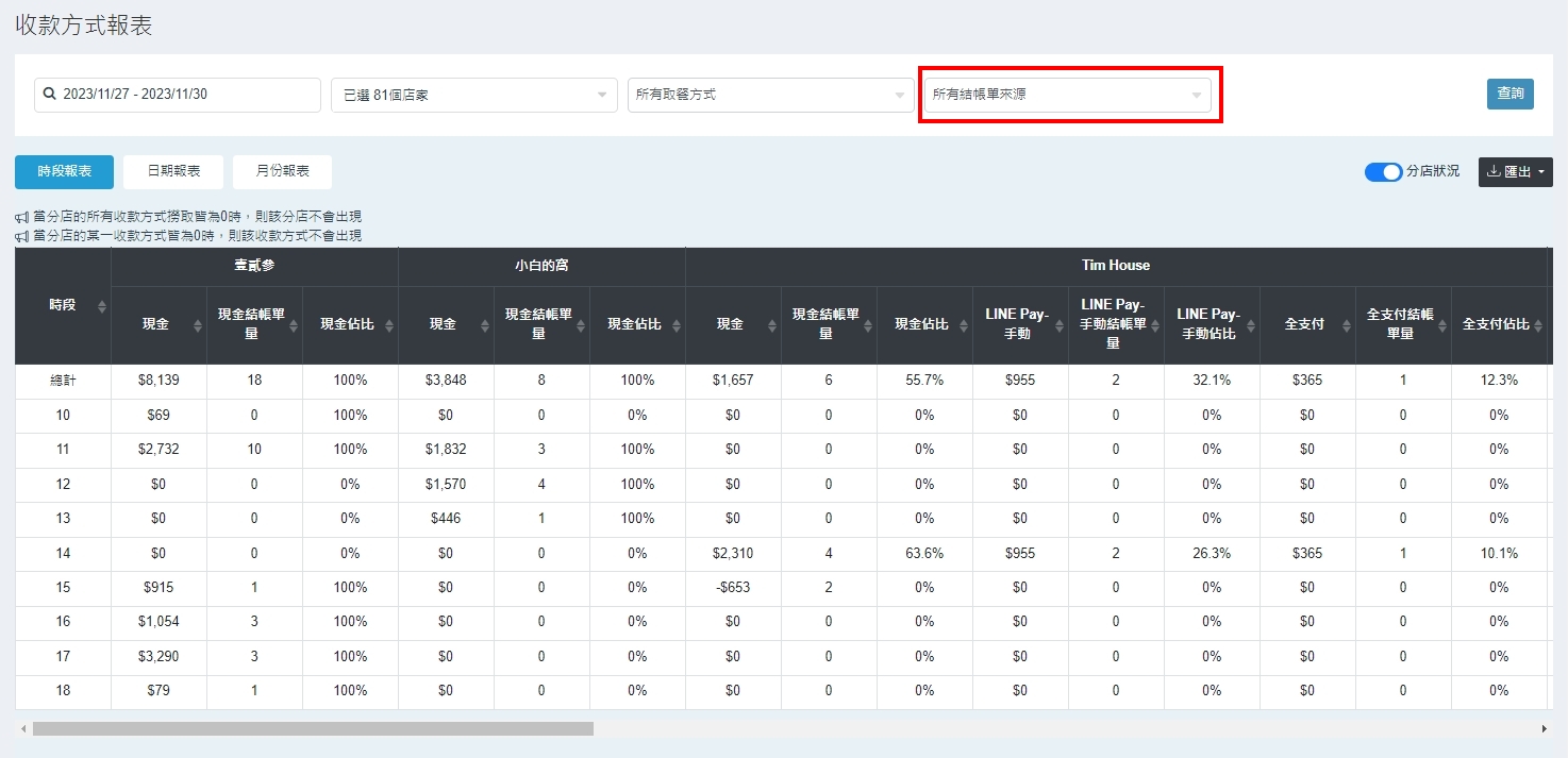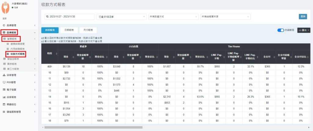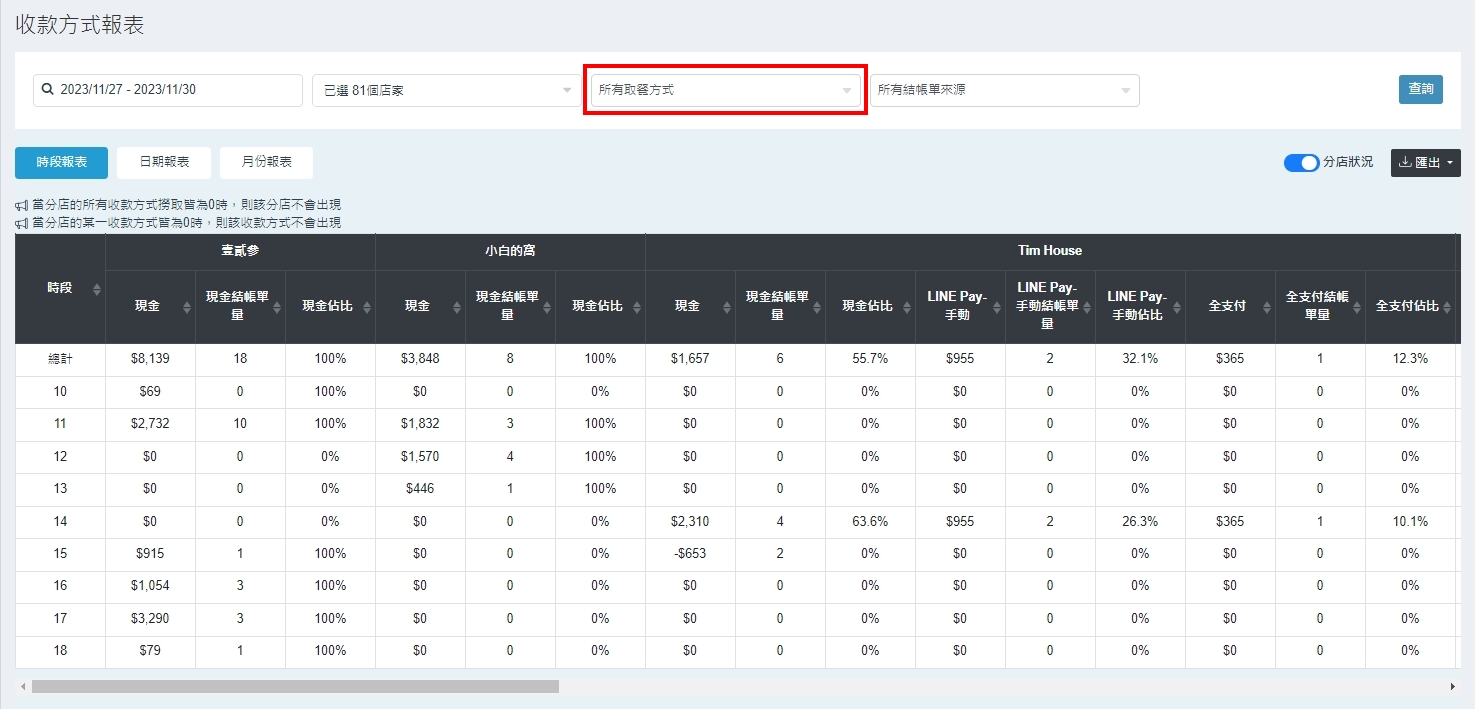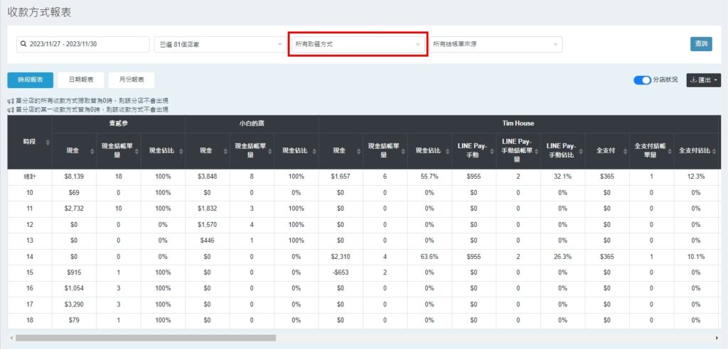 5.品牌可以選擇要查看 「各分店」或「全體」的收款方式資料