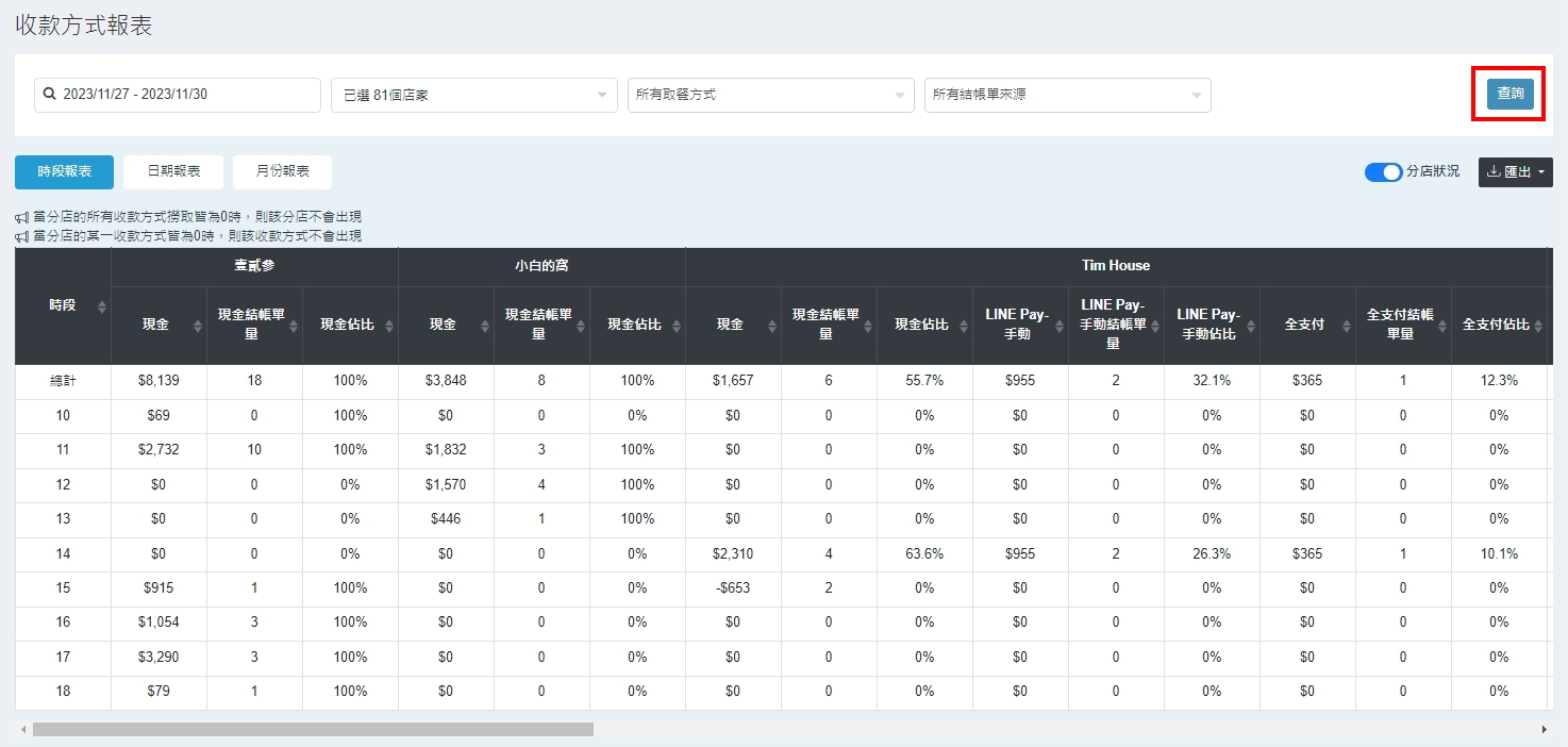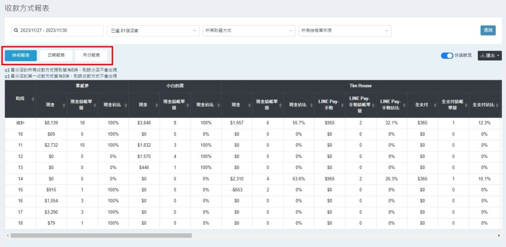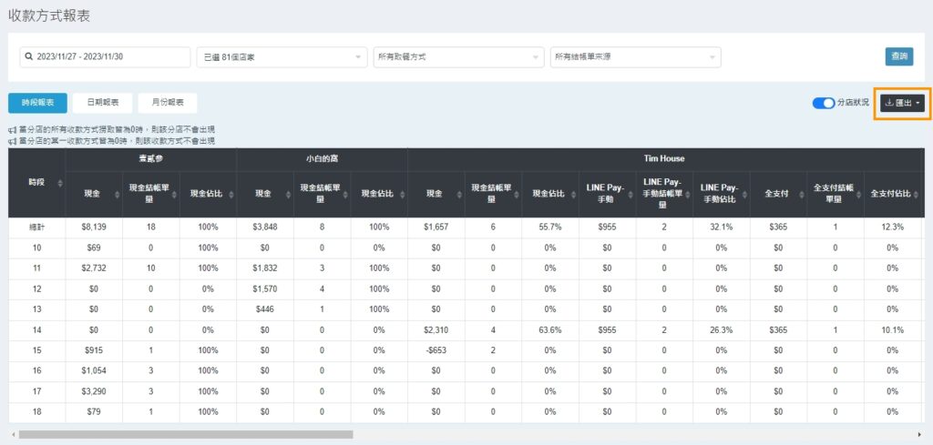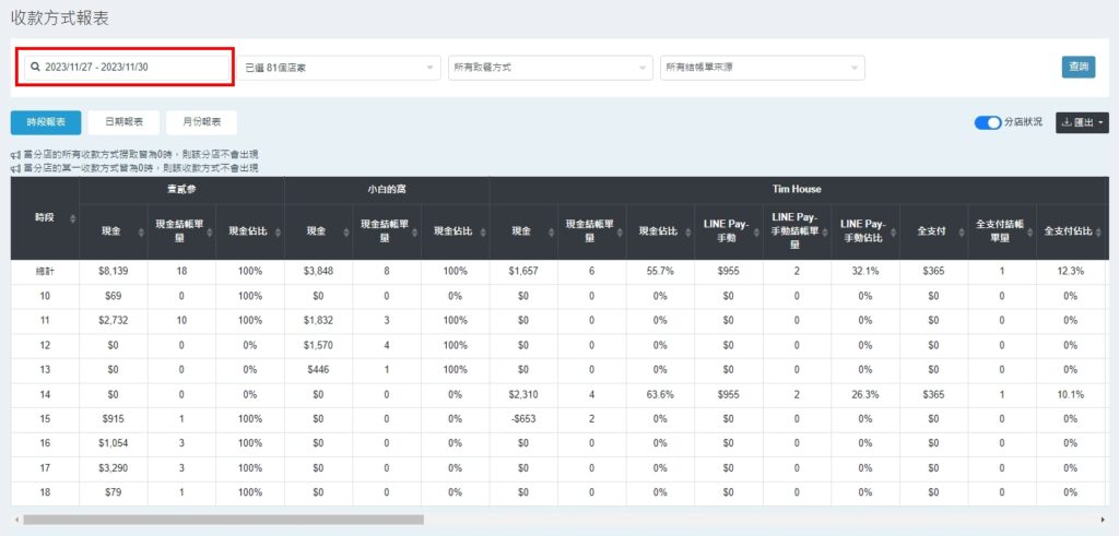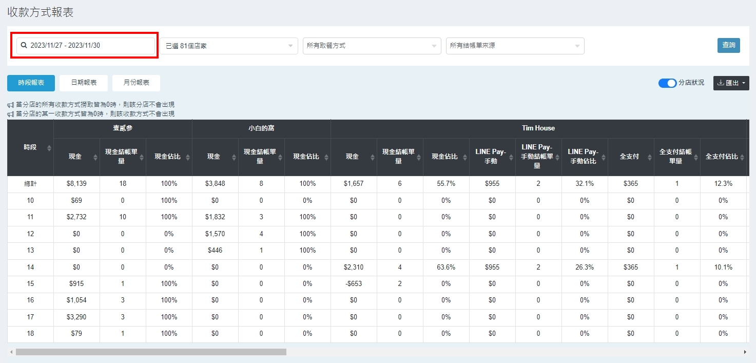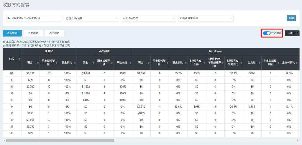 5.品牌可以選擇要查看 「各分店」或「全體」的收款方式資料