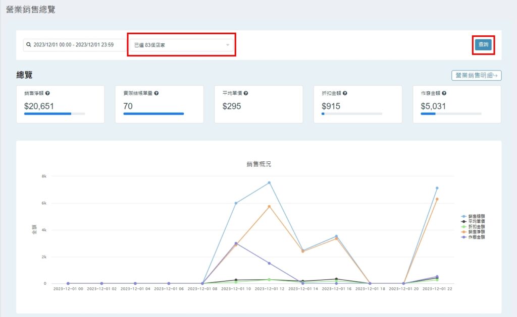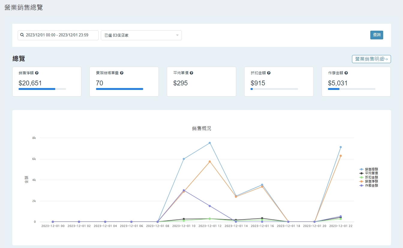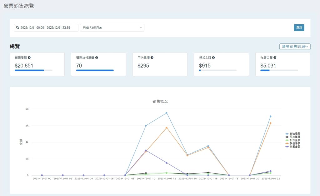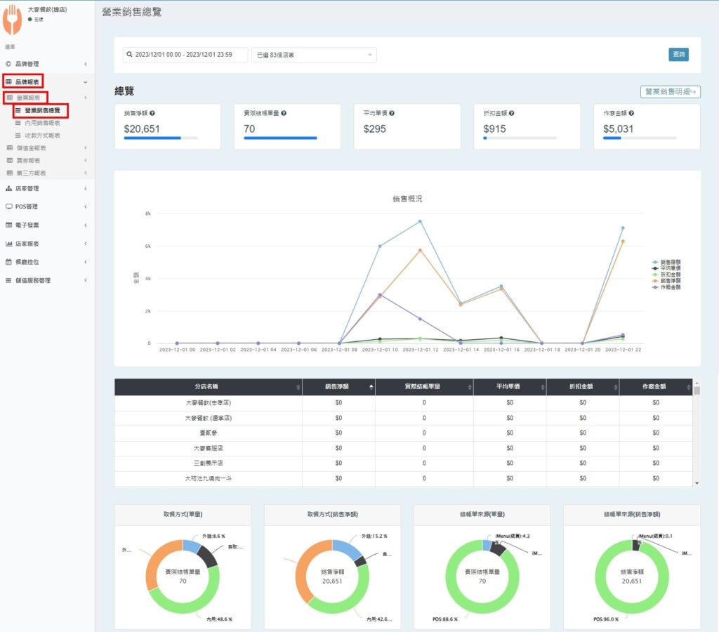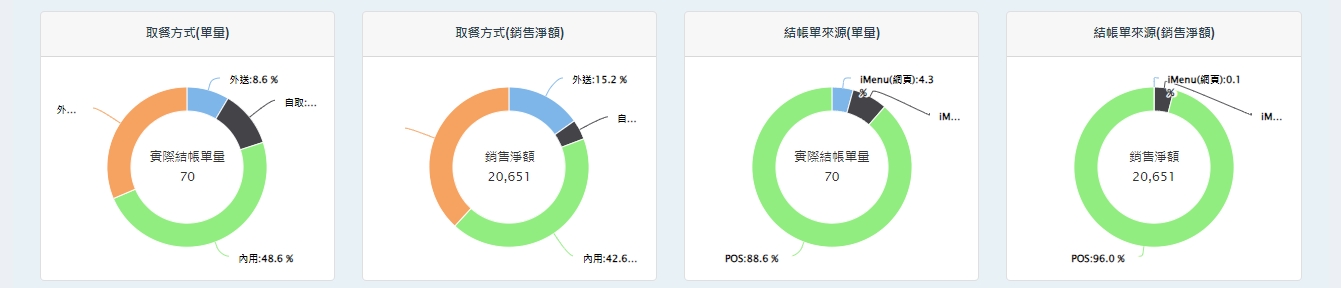搜尋 搜尋 首頁 » 後台操作 » 報表相關 » 品牌管理報表|營業銷售報表總覽 報表說明:🖍 此報表僅會記錄00:00~23:59,不支援跨日數據查詢。🖍 此報表非即時更新,因資料會是一批一批回傳,請等候30~60分鐘再進行查看。🖍 此報表在每日的00:00~01:00進行更新,如進行查詢將有可能會有查無資料的狀況發生。 ❗❗❗總覽頁面的數據,會因為其他日的操作而有【異動】。❗❗❗舉例:10/30作廢10/28的訂單,總覽頁面查詢11/28的金額會是已扣掉作廢金額的資料。 營業銷售統計報表 後台查看路徑:【品牌報表】/【營業報表】/【營業銷售報表】 此報表可先選擇需查看數據的分店,再進行查詢。 🧷說明以下資料為:篩選中的各分店加總數據。銷售淨額:為扣除作廢及折扣額之金額。實際結帳單量:扣除作廢後的結帳單數量。平均單價:銷售淨額/結帳單數量。折扣金額:扣除作廢單後的折扣總金額。作廢金額:結帳單作廢總金額。🟠此頁數據將為最新資料,會隨著操作隨時變動。 此表格將條列出搜尋的指定分店銷售概況。 往下查看可以看到搜尋的日期間,取餐方式與結帳單來源之圓餅圖 鼠標移到色塊上,可以看到所有取餐方式的比例與訂單來源、數量。 ✍🏻找到答案了嗎? Let us know if you liked the post. That’s the only way we can improve. 🙂 🙁 Categories: 其他報表相關後台操作最新資訊營業額Tags: 報表小時時段時間營業銷售報表營業銷售時段報表營業額銷售報表