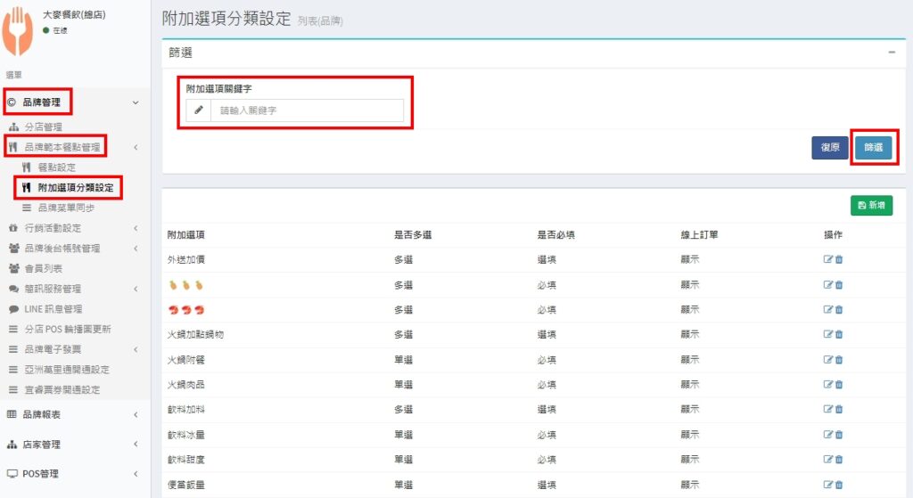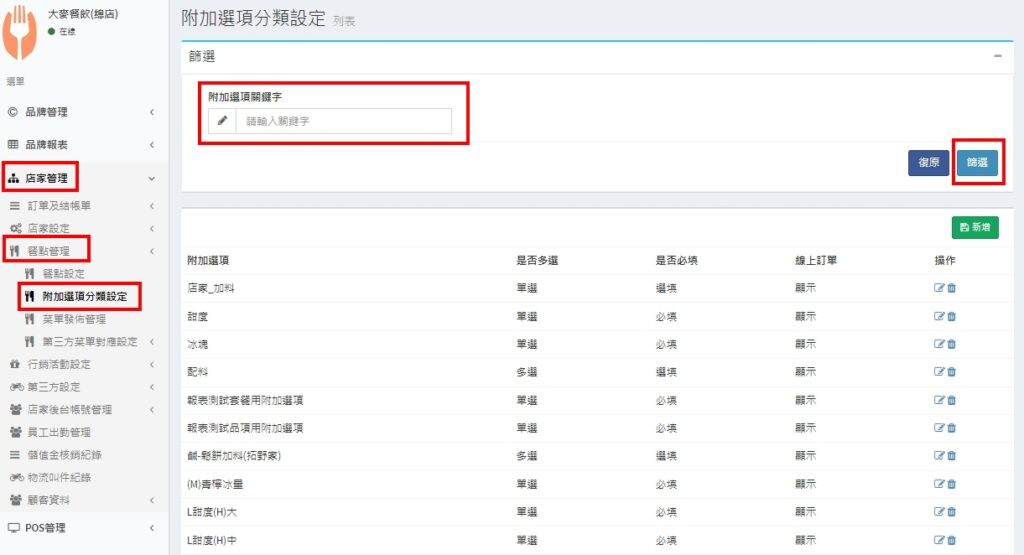 搜尋 搜尋 首頁 » 最新資訊 » 後台菜單編輯| 篩選附加選項 還在為了找不到選項而感到困擾嗎? 現在附加選項有搜尋功能囉! 請點擊連結開始進行設定:品牌管理:品牌管理 > 品牌範本餐點管理 > 附加選項分類設定店家管理:店家管理 > 餐點管理 > 附加選項分類設定 在【附加選項關鍵字】的欄位,輸入想要查詢的字眼,接著點擊【查詢】,就可以進行篩選囉~ 品牌管理操作步驟畫面: 店家管理操作步驟畫面: ✍🏻找到答案了嗎? Let us know if you liked the post. That’s the only way we can improve. 🙂 🙁 Categories: 其他後台操作最新資訊菜單設定附加選項設定Tags: 分類建置菜單設定選擇選項附加附加選項