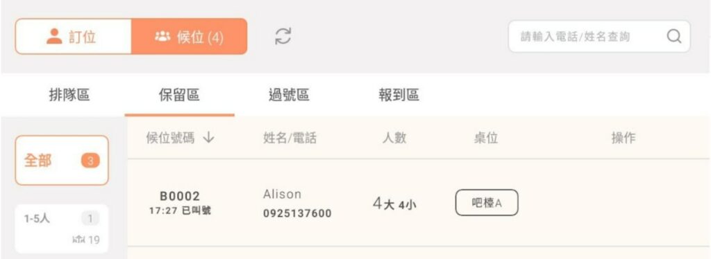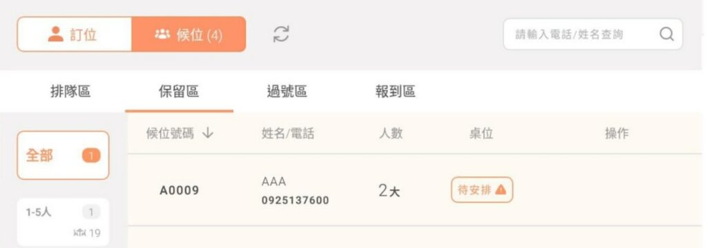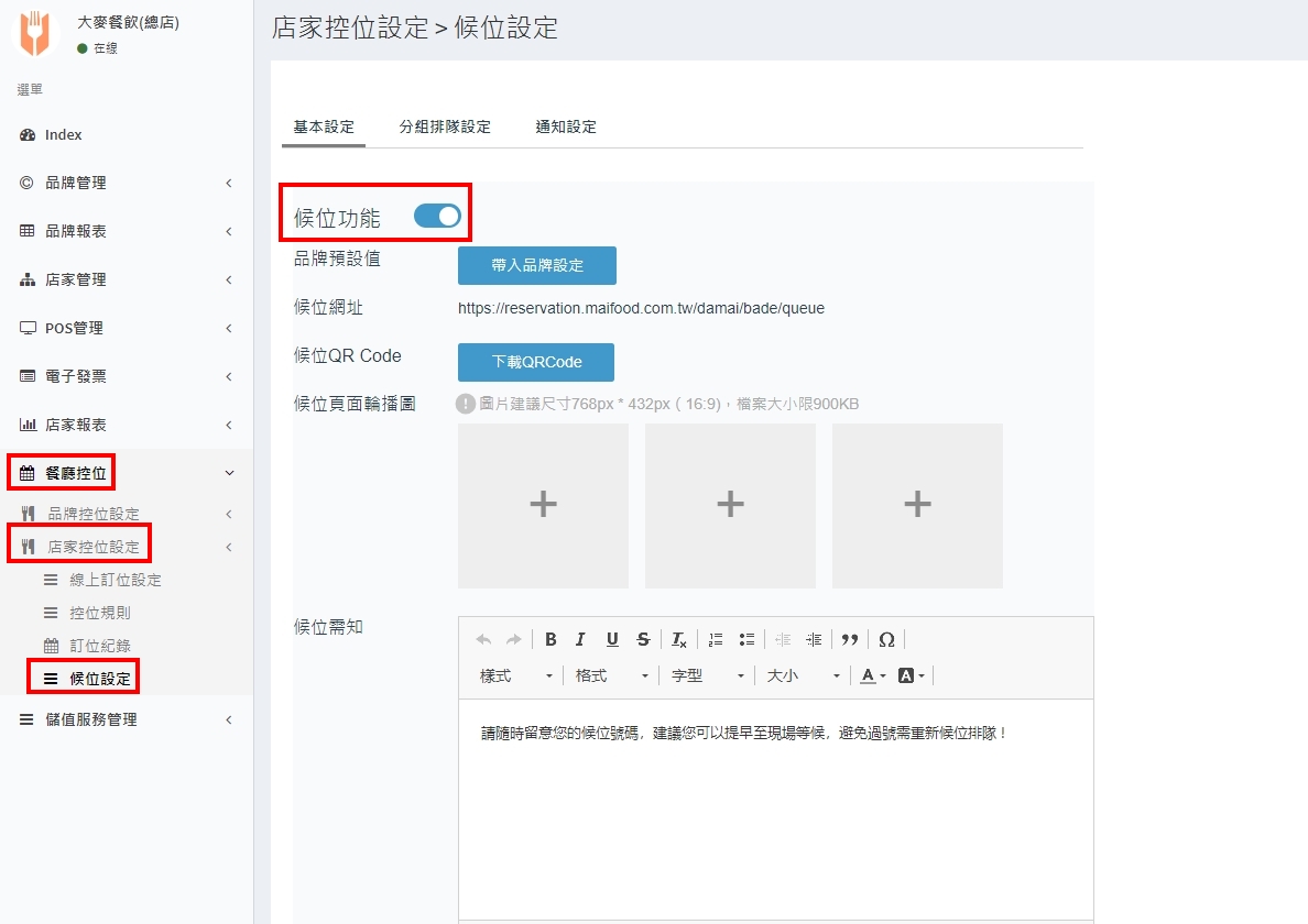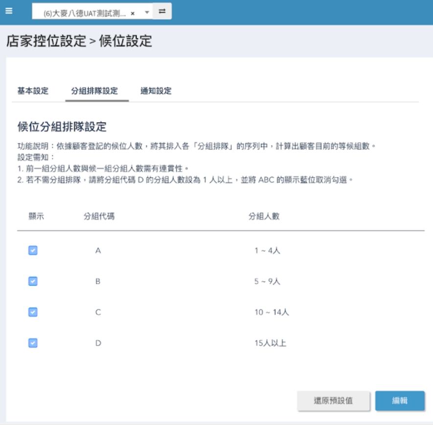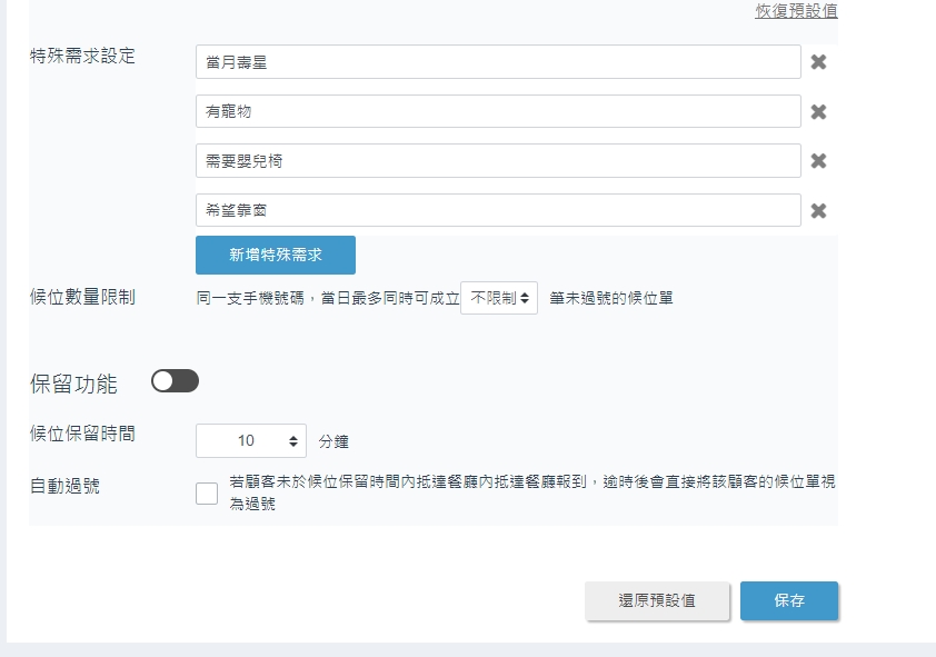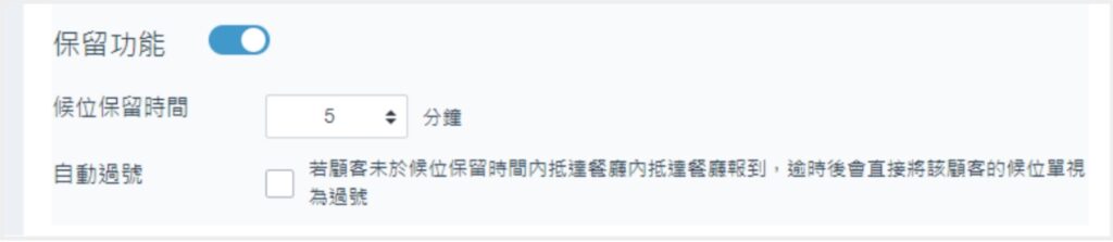 搜尋 搜尋 首頁 » 最新資訊 » 候位-後台操作 候位規則了解候位規則應如何設定!*提醒您,候位需有控位模組才可以使用哦!登入後台>餐廳控位>店家控位設定>候位設定>基本設定>候位功能開啟 候位的QRCODE可以下載提供給現場的消費者進行候位哦!候位頁面輪播圖:可以自行上傳圖片,會顯示於候位網頁上候位通知:可以提醒消費者候會的須知或是注意事項 特殊需求設定:可以自行新增或是刪除,新增的上限為6個。候位數量限制:可以限制消費者一天只能候位幾次。 保留功能保留功能開啟,可以設定候位保留的時間,時間有不限制﹑5﹑10﹑15﹑20可以選擇。若設定不限制,則不會出現叫號時間。 若有開啟,POS上點選叫號後,下方會出現叫號的時間,若已逾時也會顯示,在手動按過號即可。若有開啟自動過號,那麼候位逾時,該筆候位單會自動到過號區唷! 分組排隊設定可以依不同的用餐人數來進行分組,分組上限僅能分成4組。設定時,數字必須有連貫性,若無連貫性,有跳號的狀況,系統會跳出錯誤提示,且無法保存。若無需進行人數的分組,請點選編輯>將A﹑B﹑C取消勾選,並將D的人數改為1>保存即可。 通知設定通知功能開啟,消費者候位時,系統會自動判斷該消費者是否為會員,是否有綁定LINE帳號,候位成功會發送OA推播給消費者,消費者即可查詢候位狀態。若有勾選簡訊,也會同步收到簡訊,到號通知和候位取消是否需要通知,也可以自行勾選。另外,也可以分別針對【候位成功】﹑【到號通知】﹑【候位取消】來設定簡訊的內容。 ✍🏻找到答案了嗎? Let us know if you liked the post. That’s the only way we can improve. 🙂 🙁 Categories: 後台操作控位系統最新資訊