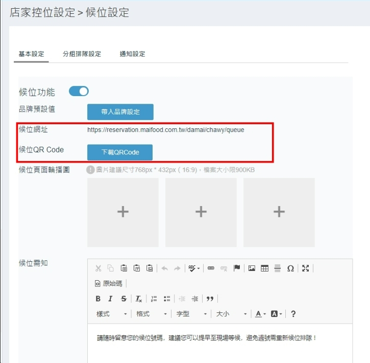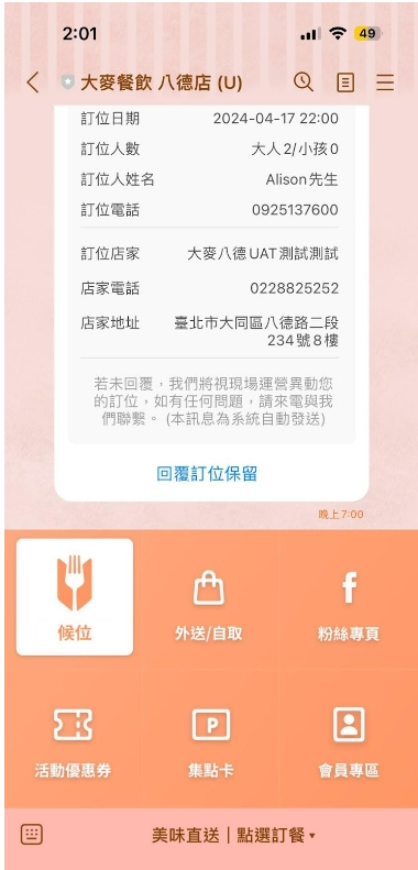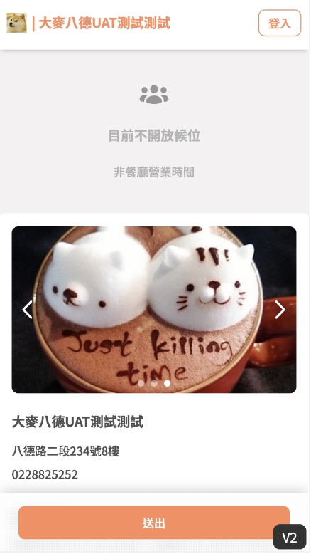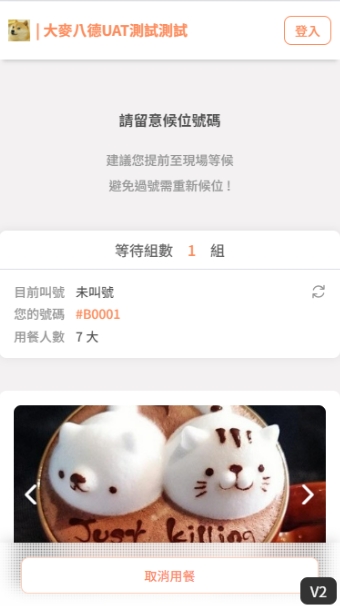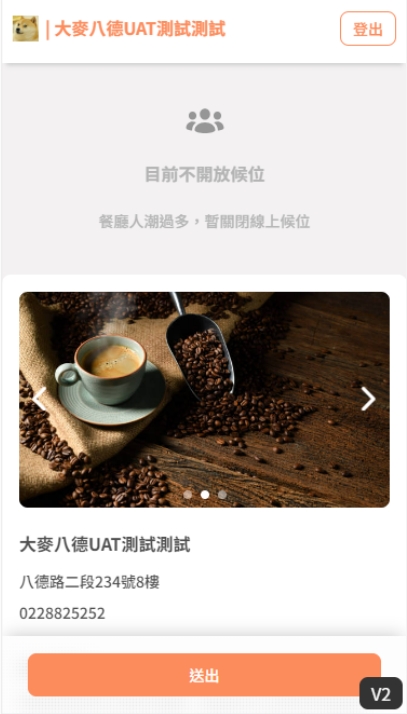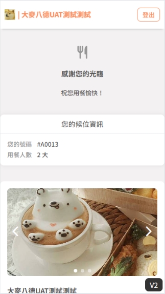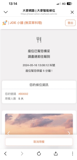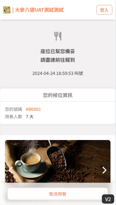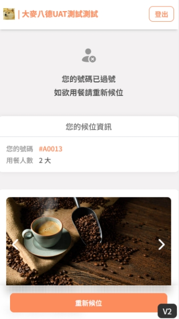 搜尋 搜尋 首頁 » 最新資訊 » 候位-消費者候位操作 候位功能已上線,若想了解此功能,請和大麥售後客服聯繫。消費者可以使用以下三種方式進入候位頁面1.官方帳號的圖文選單2.候位QRCODE 候位操作步驟:掃描QRCODE/點選圖文選單>進入候位網頁>輸入候位資訊>送出消費者的候位頁面,會依不同的狀態而有不同顯示。 消費者若需要取消候位,是可以在候位成功和到號頁面進行取消候位。 候位成功 候位的等待組數計算,需要將自己納入,若前面有一組客人在等待,加上自己,所以等待組數會是2組叫號目前是可以不依候位編號的順序來進行叫號,這部分還需麻煩店家和消費者說明,因消費者端是可以查看的。 到號頁面 若有設定保留時間,則會顯示保留幾分鐘。 過號頁面 報到頁面 消費者無法候位的狀況有【非店家營業時間】﹑【店家開啟暫停候位】﹑【已關閉候位功能】。不同的狀況有不同的顯示畫面。非營業時間 暫停候位 關閉候位功能 ✍🏻找到答案了嗎? Let us know if you liked the post. That’s the only way we can improve. 🙂 🙁 Categories: 控位系統最新資訊消費者使用引導