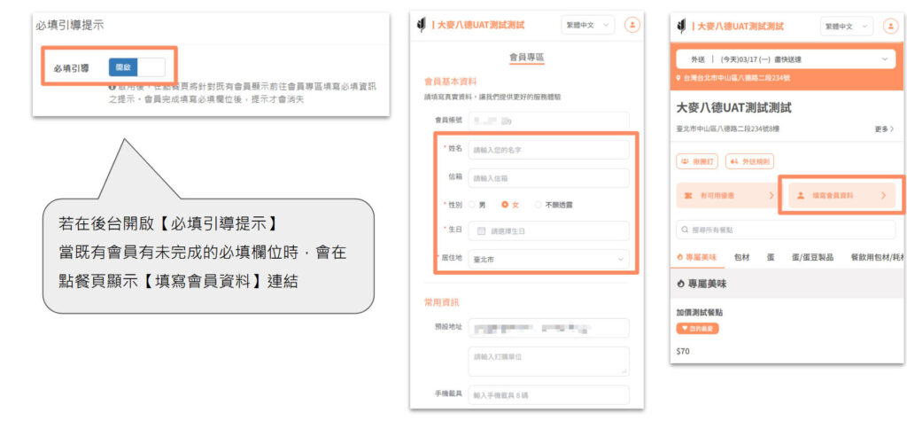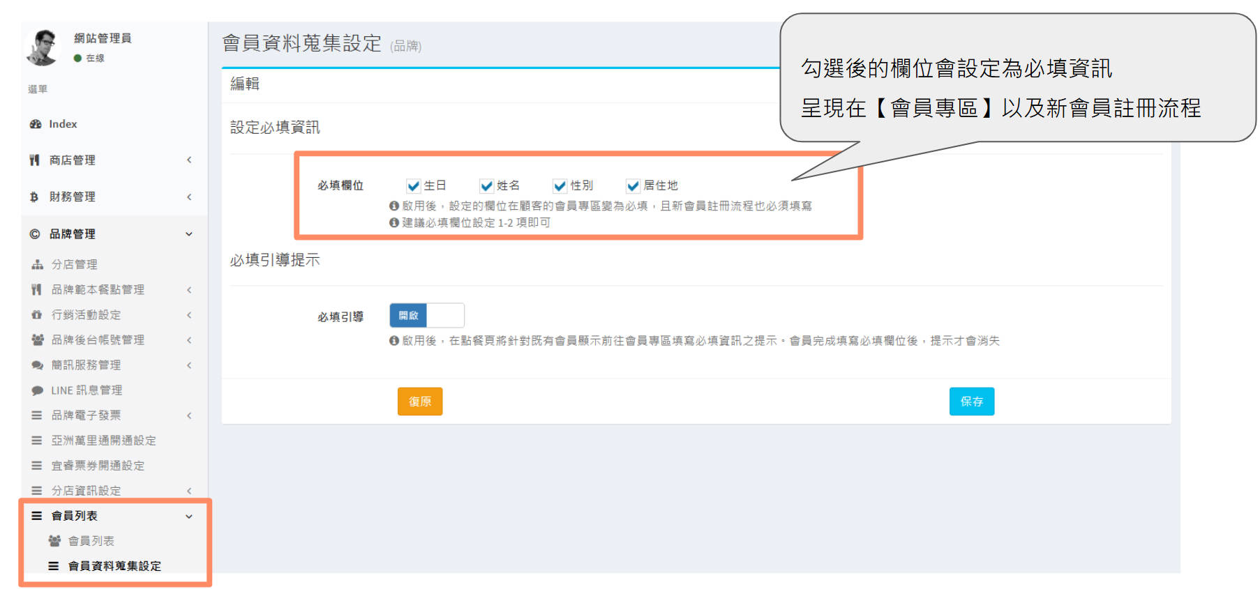搜尋 搜尋 會員資料蒐集設定 新功能<會員資料蒐集設定頁>上架囉,在本手冊中,我們將帶您了解如何在我們的後台系統中設置會員註冊時的必選內容。這些必填項目包括:姓名、生日、性別及居住地等基本資料。這些信息不僅有助於提升會員管理的精準度,也能讓您提供更加個性化的服務和體驗。請按照本手冊的步驟進行操作,您將能夠輕鬆設置這些必要欄位,並確保會員註冊流程順暢且符合您的需求。 1. 來到品牌管理>會員列表>會員資料蒐集設定>勾選必填資訊和提示>保存 2.新會員的註冊流程依照「會員資料蒐集設定」顯示對應欄位(至此即完成設定囉) 3. 若有開啟必填提示,則會出現必填資訊的 iMenu 引導提示 ※會員列表新增欄位:性別、生日、居住地 ※可以於大麥後台>店家管理>顧客資料>顧客清單查看顧客資料 搜尋 搜尋 ✍🏻找到答案了嗎? Let us know if you liked the post. That’s the only way we can improve. 🙂 🙁 Categories: 後台操作最新資訊會員相關