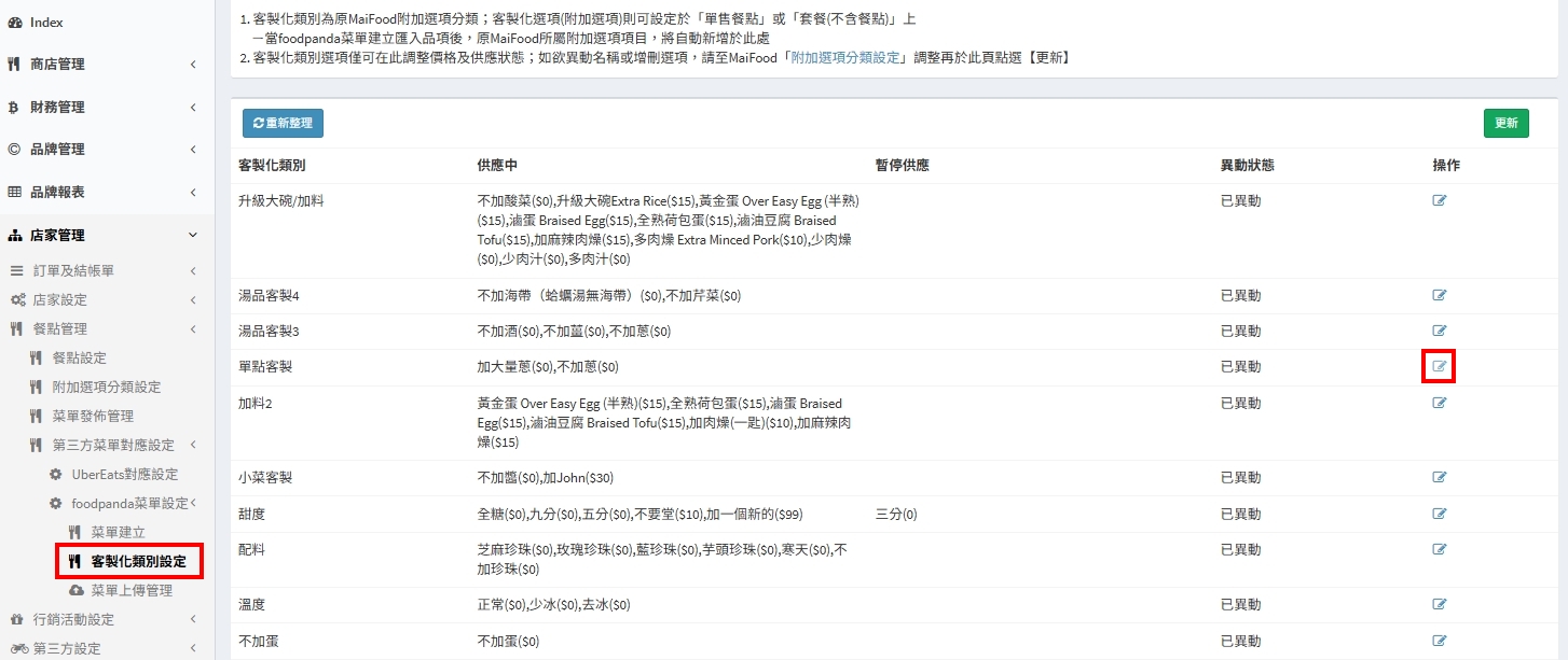 情境三. 大麥的餐點要繼續販售,foodpanda要調整為售完