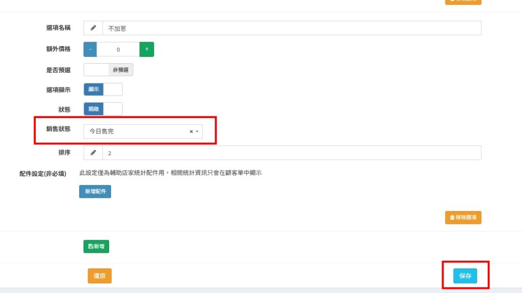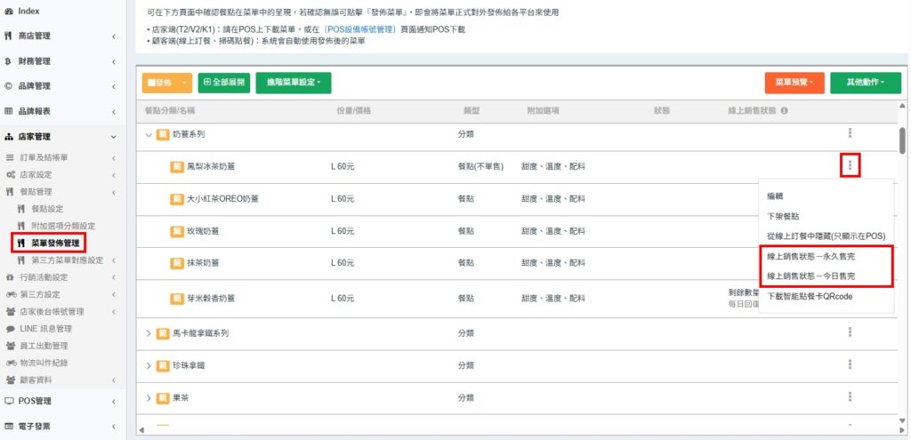 當餐點銷售完畢、要留給現場客或要暫停銷售時,需要調整餐點的銷售狀態,以避免消費者訂購。