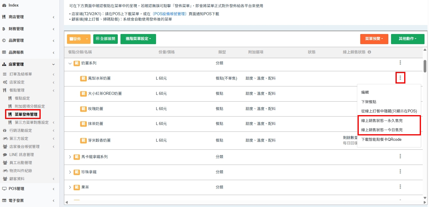 【店家管理 > 餐點管理 > 菜單發佈管理 > 展開分類 > 對該品項點選右側的「˙˙˙」> 設定『今日售完』or『永久售完』> 發佈】