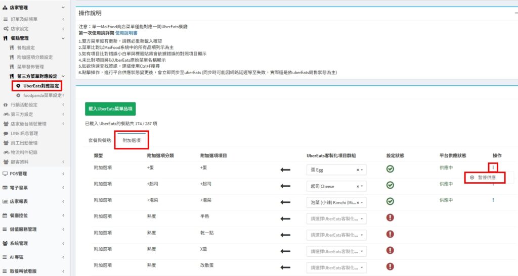 • 在大麥POS、菜單發佈管理、附加選項分類設定等位置調整銷售狀態時,Uber Eats也會連動變更狀態。