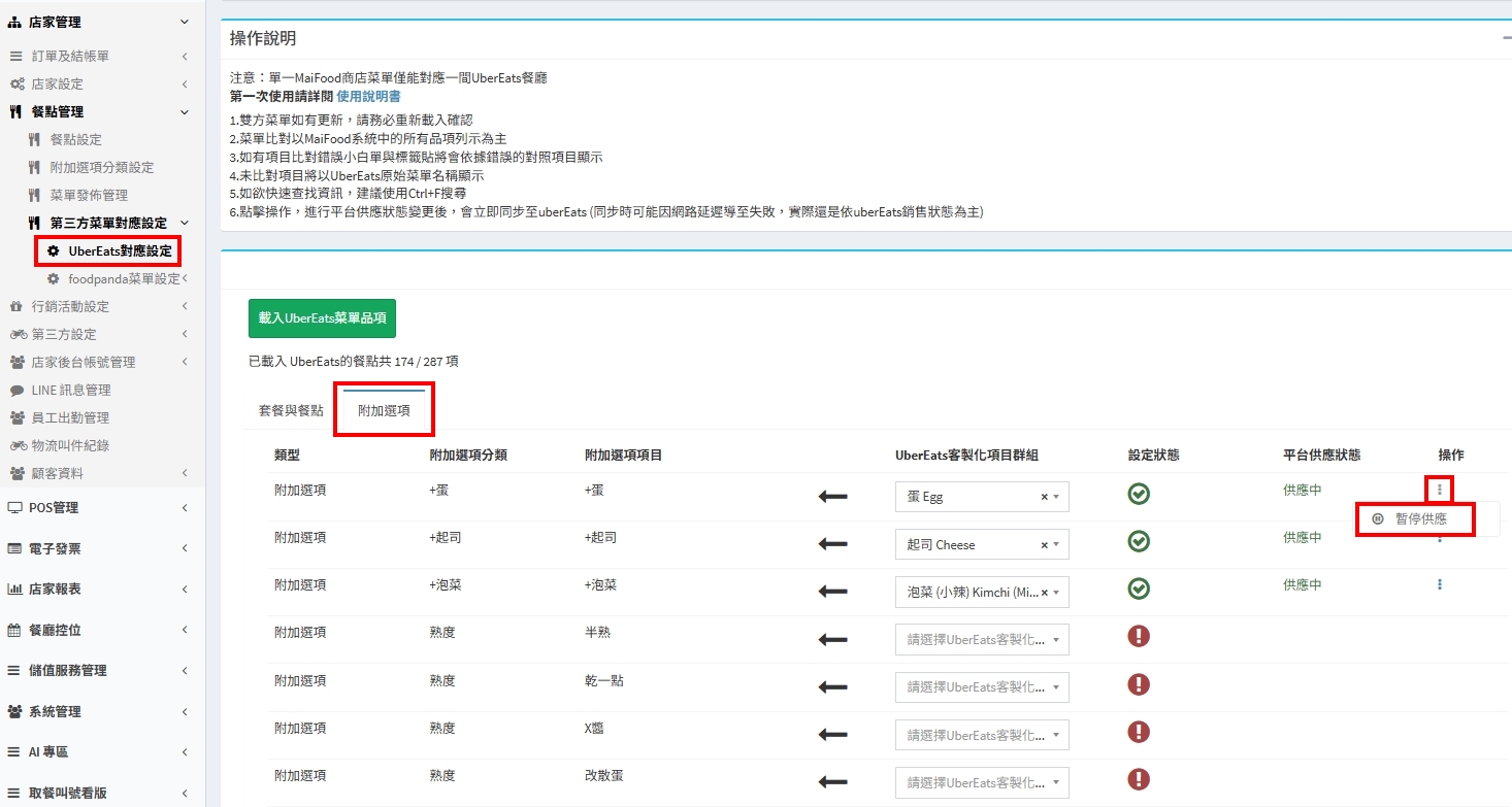 【店家管理 > 餐點管理 > 第三方菜單對應設定 > Uber Eats對應設定 > 附加選項 > 對該品項點選右側的「˙˙˙」> 設定『暫停供應』 > 保存 】