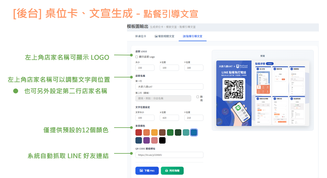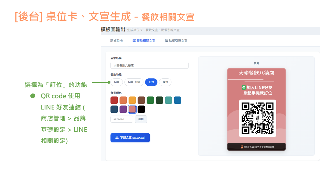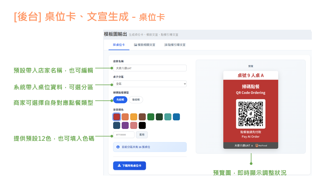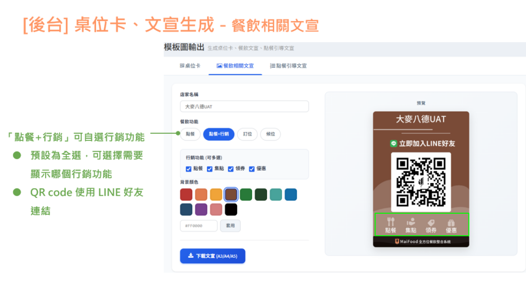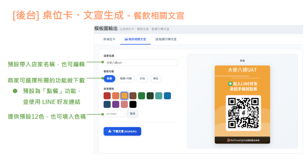 桌位卡、文宣生成 功能說明 店家可透過此功能自行下載餐飲店家相關的文宣等圖片路徑:大麥後台>店家管理>模版圖輸出 桌位卡 貼心提醒:色碼可於瀏覽器中搜尋『色碼查詢』,比對您喜歡的顏色,並將色碼記下來唷! 餐飲相關文宣 點餐: 點餐+行銷: 訂位: 候位: 點餐引導文宣